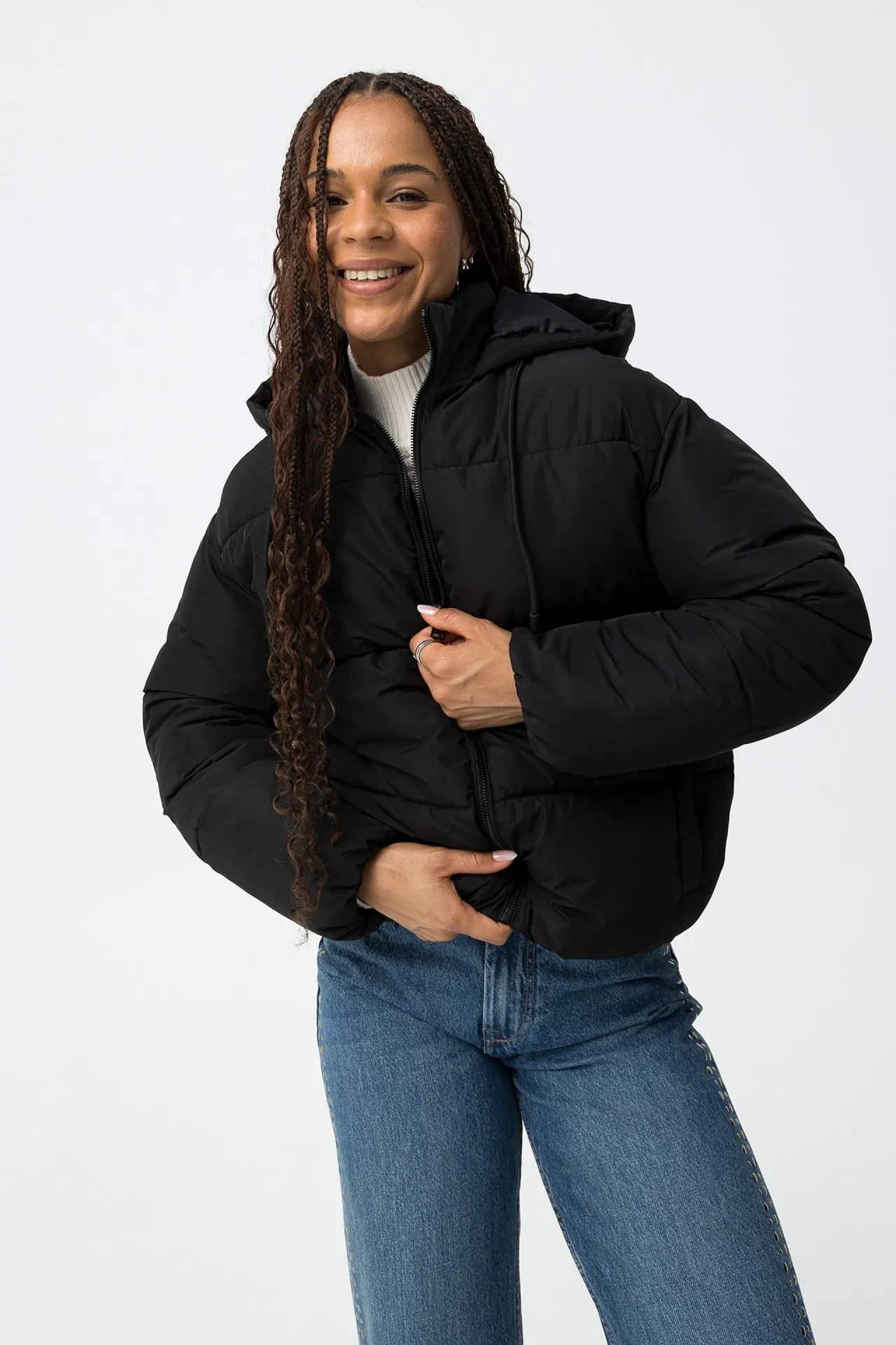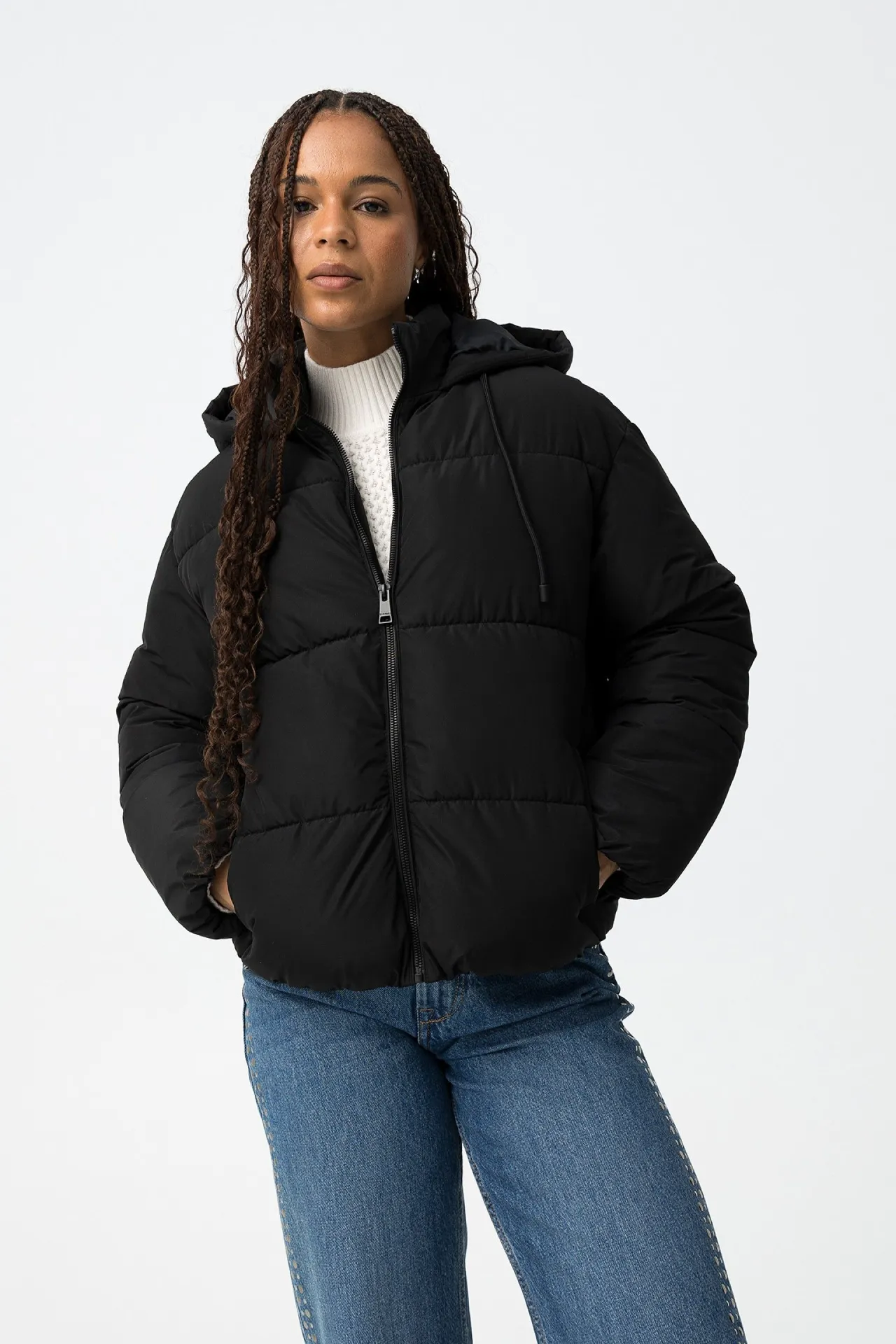 Abrigo acolchado relaxed fit para mujer, con capucha ajustable, bolsillos frontales y cierre de cremallera. Disponible en negro y rojo.