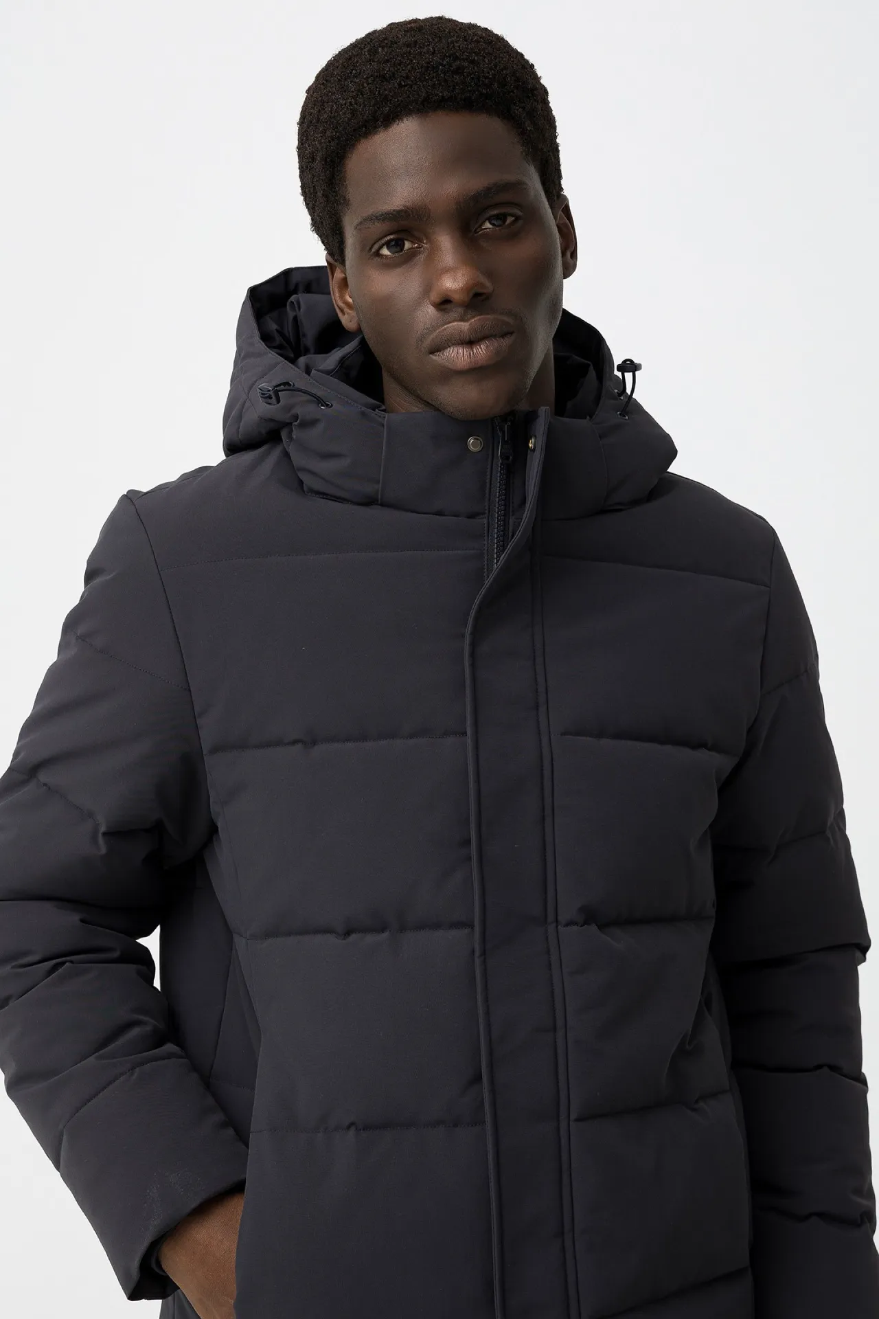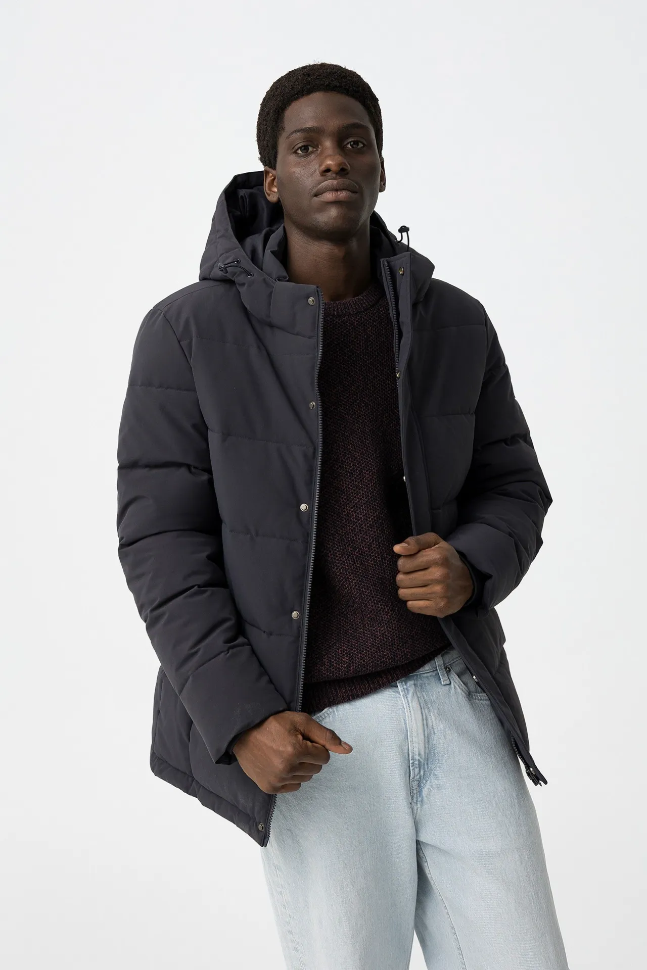 Abrigo acolchado de hombre con capucha desmontable. Corte regular, cierre combinado de cremallera y botones, y diseño cálido y funcional perfecto para el invierno.