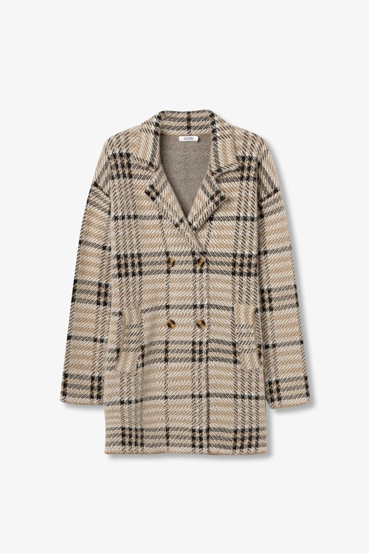 Abrigo largo de punto con estampado de cuadros, solapa de muesca y cierre cruzado con botones. Estilo relajado, suave y cómodo.