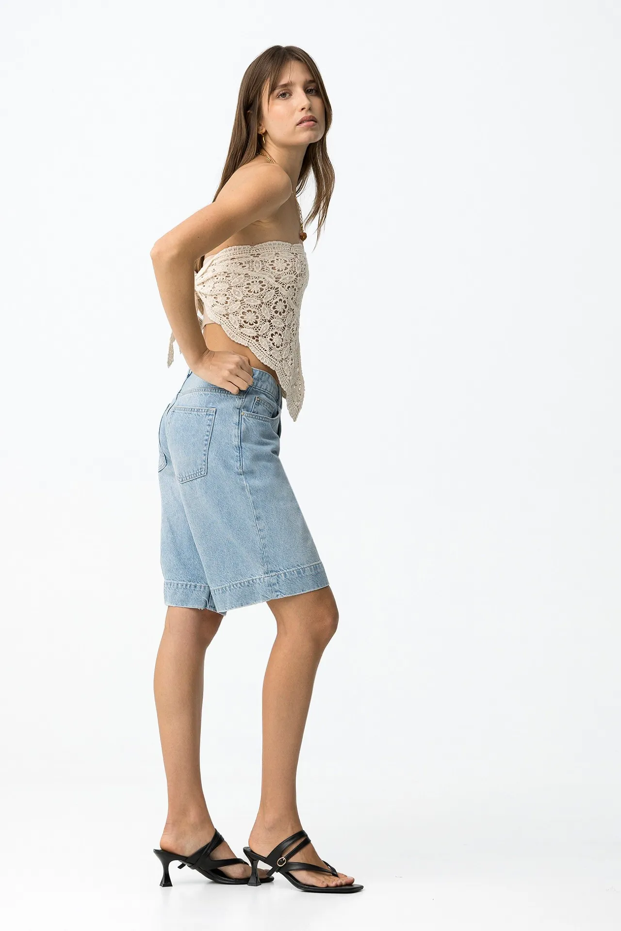 El modelo presenta un corte ancho que aporta un aire actual y relajado al conjunto. La longitud tipo bermuda resulta muy versátil, ya que ofrece más cobertura que un short tradicional sin perder frescura. El denim azul claro aporta un estilo veraniego muy fácil de combinar con diferentes prendas del armario.