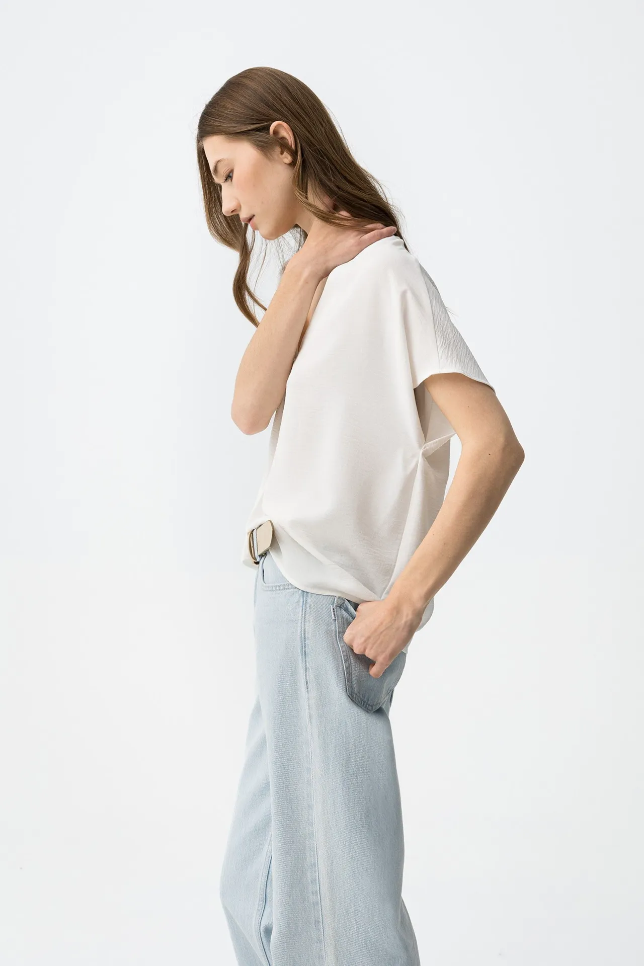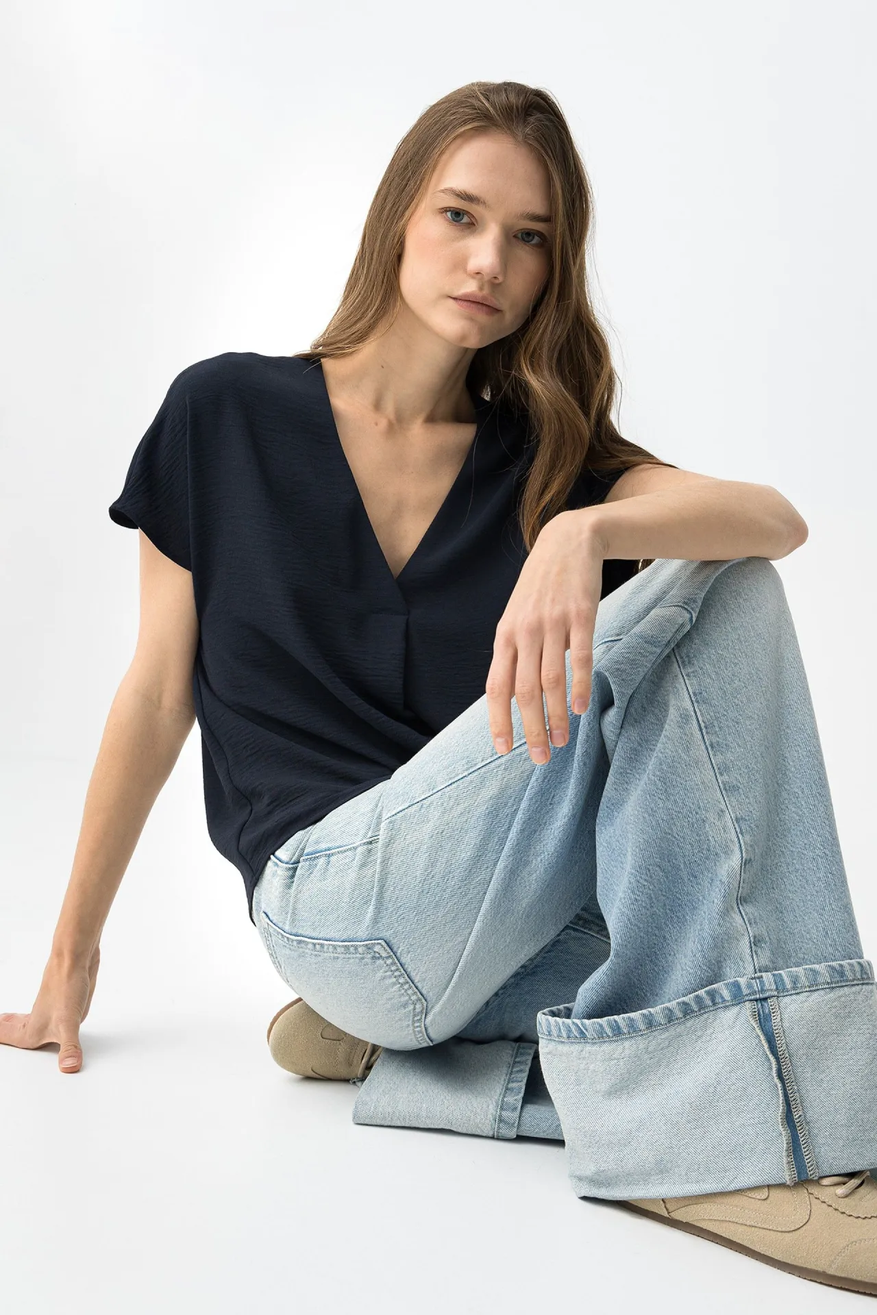 Blusa fluida para mujer con escote en V, manga corta y corte relajado. Una prenda cómoda y versátil que funciona tanto para looks casuales como para outfits más cuidados.