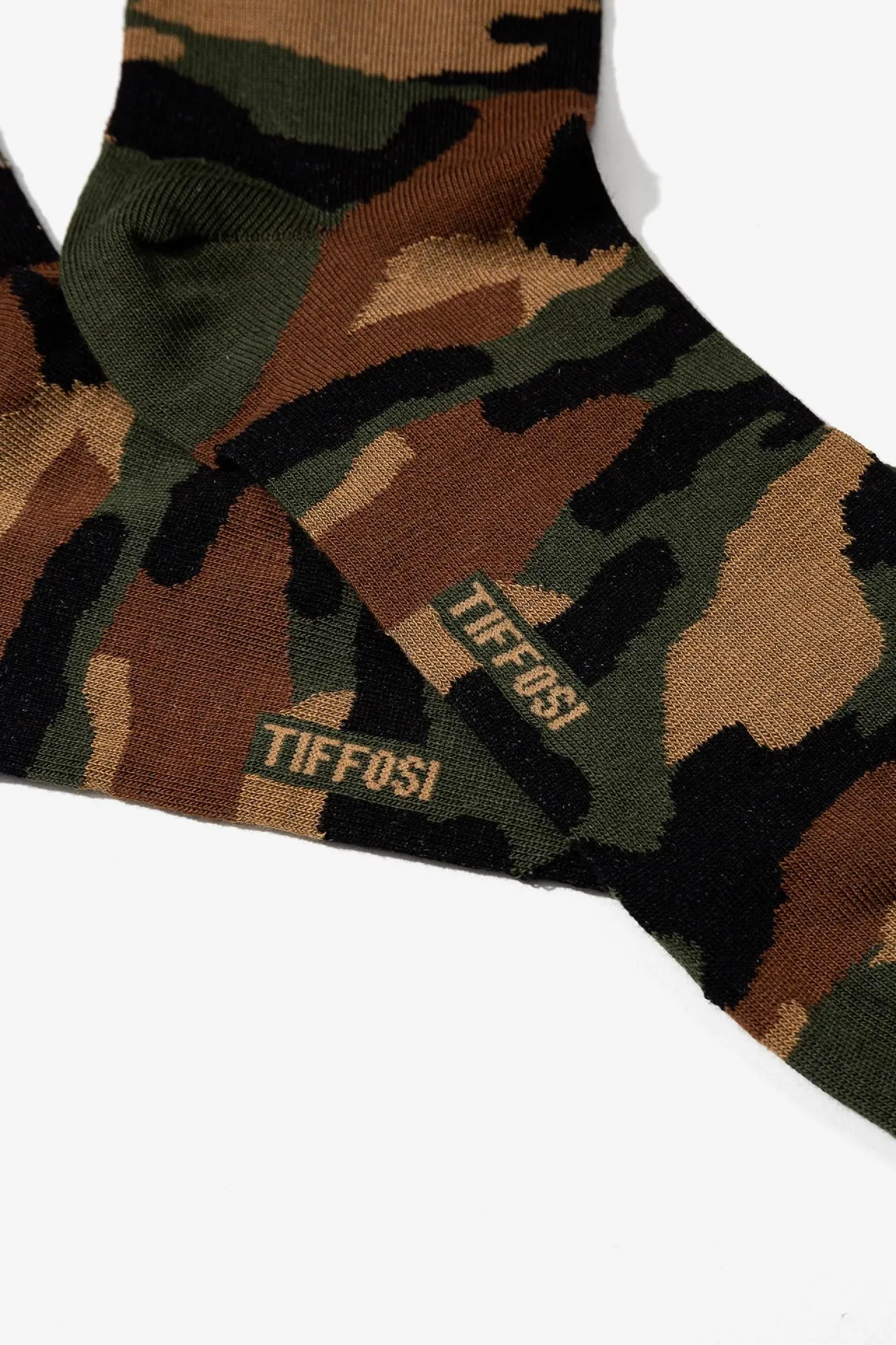 Calcetines para hombre con estampado camuflaje en tonos verdes y marrones. Confeccionados en algodón elástico, ofrecen suavidad, comodidad y un estilo moderno con el logo Tiffosi en el lateral.