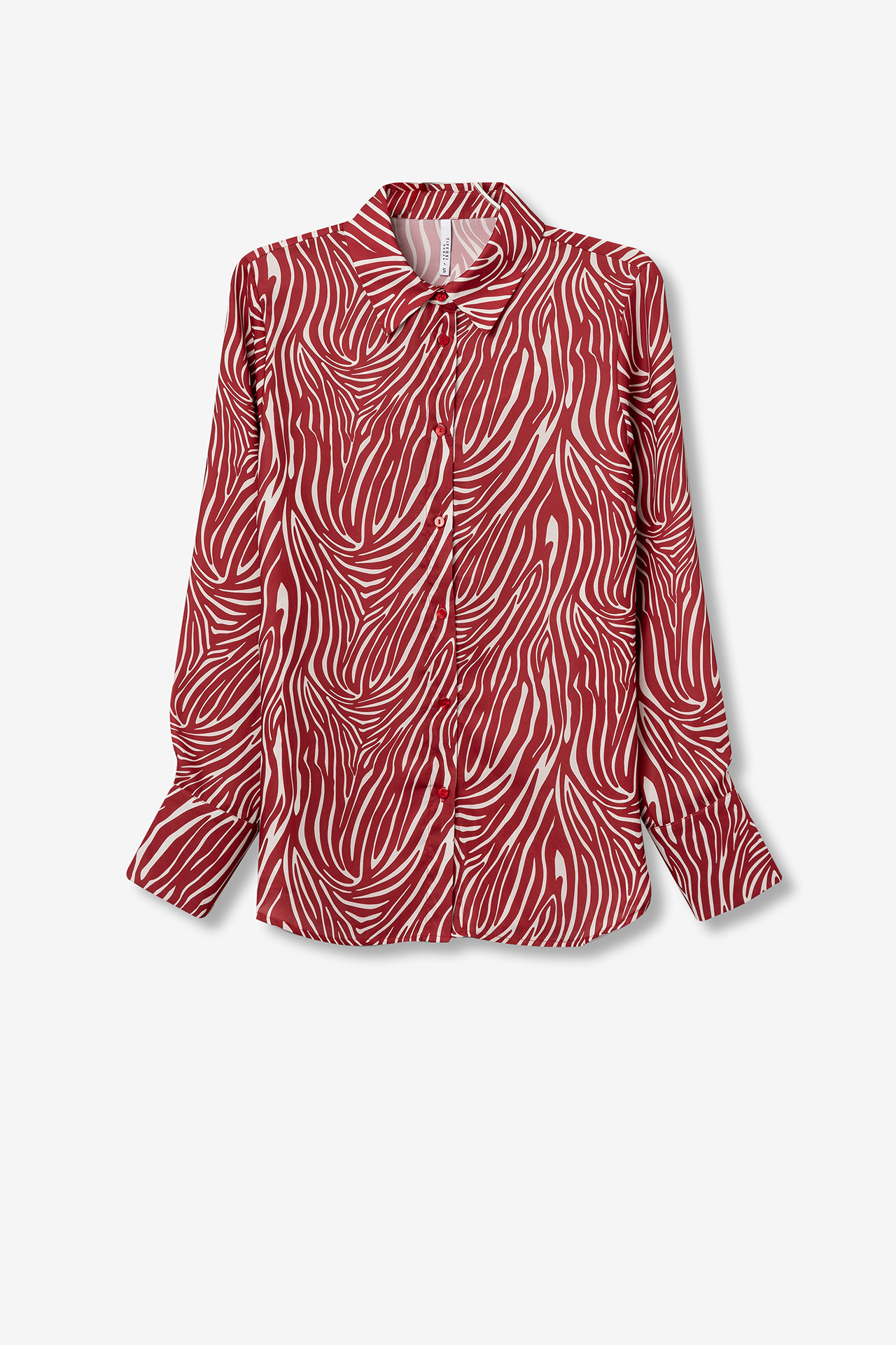 Camisa satinada roja con estampado zebra para mujer. Regular fit, cuello camisero, manga larga y cierre de botones.