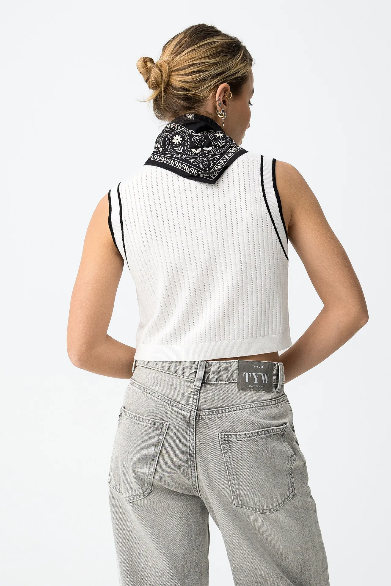 Camiseta cropped sin mangas para chica en color blanco con botones frontales y detalles en negro. Diseño moderno en tejido de punto ligero.