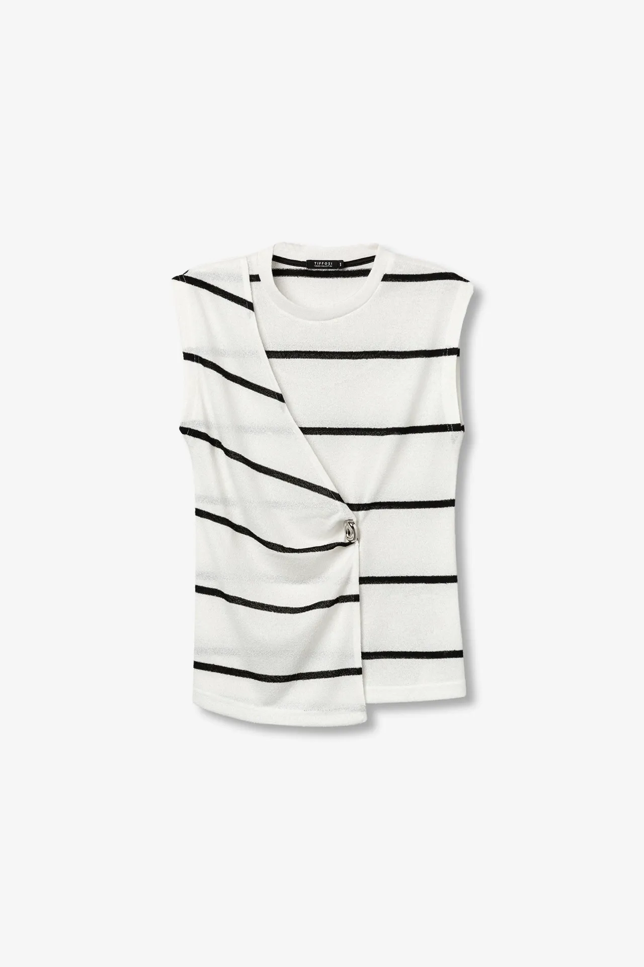 Camiseta de hilo sin mangas para mujer en color crudo con rayas negras. Presenta corte regular y un original cierre cruzado con detalle metálico en la parte frontal que estiliza la silueta. Confeccionada en mezcla de poliéster y viscosa para un tacto ligero, suave y cómodo.