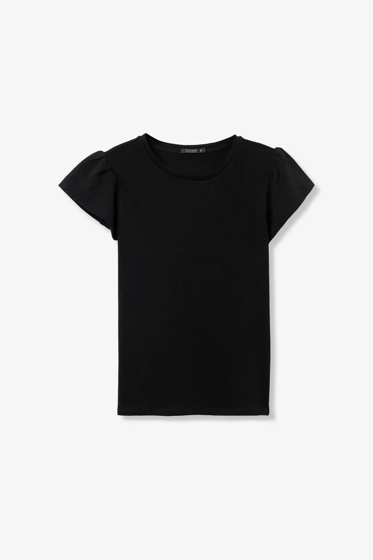 Camiseta en color negro con cuello redondo y mangas con volantes. Un básico femenino y fácil de combinar que aporta estilo sin renunciar a la comodidad.