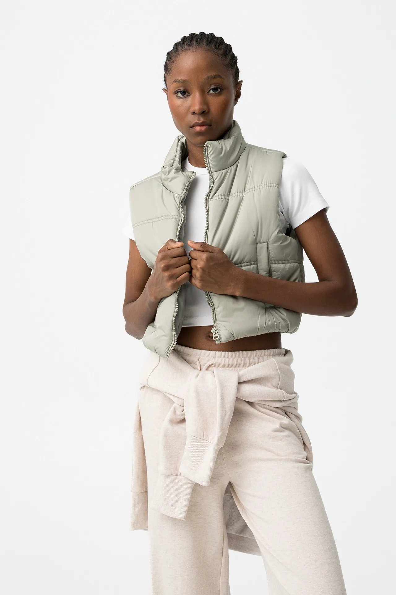 Chaleco acolchado regular fit con cuello alto, cierre de cremallera y bolsillos laterales. Disponible en negro y verde. Ideal para entretiempo.