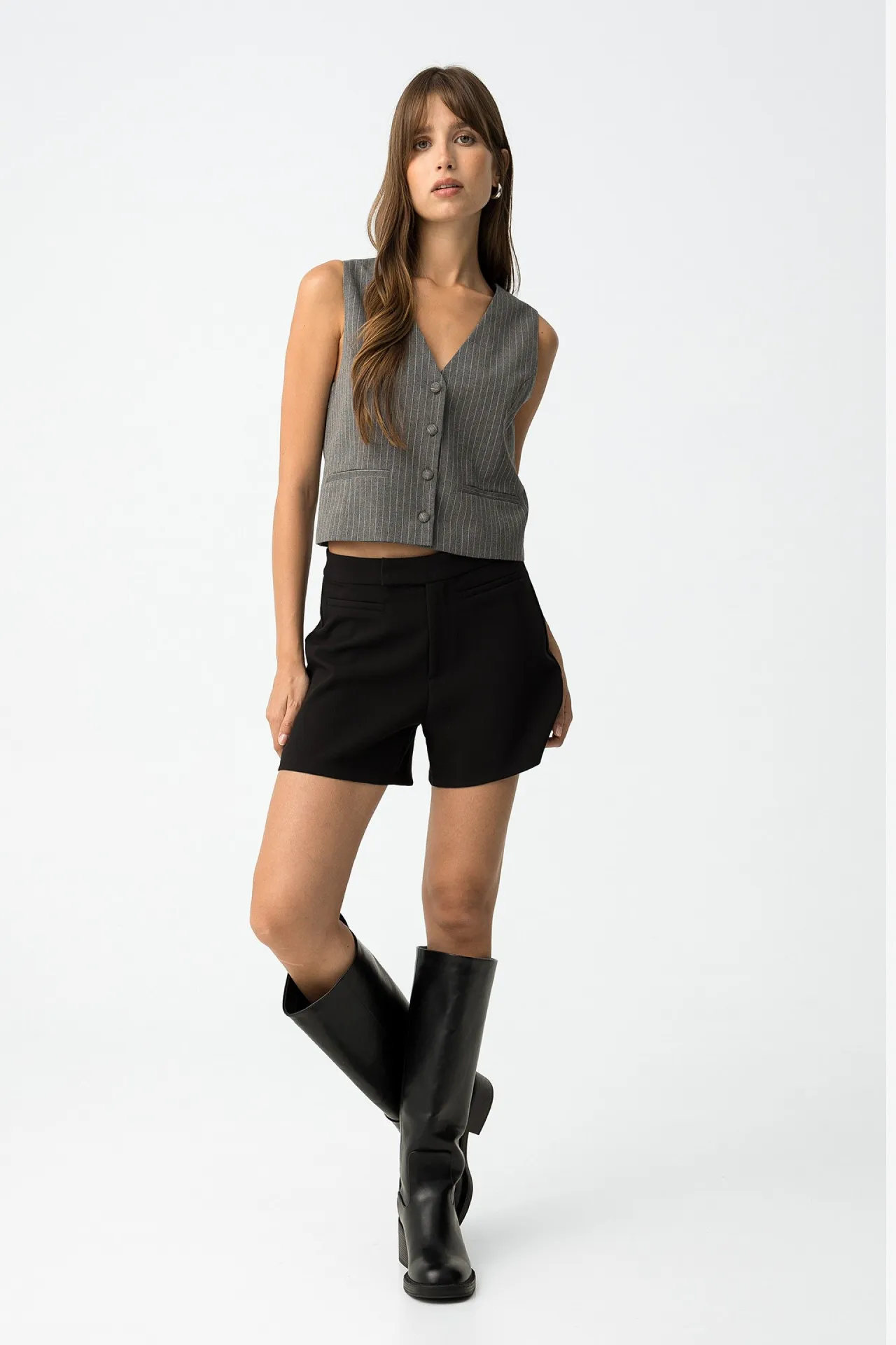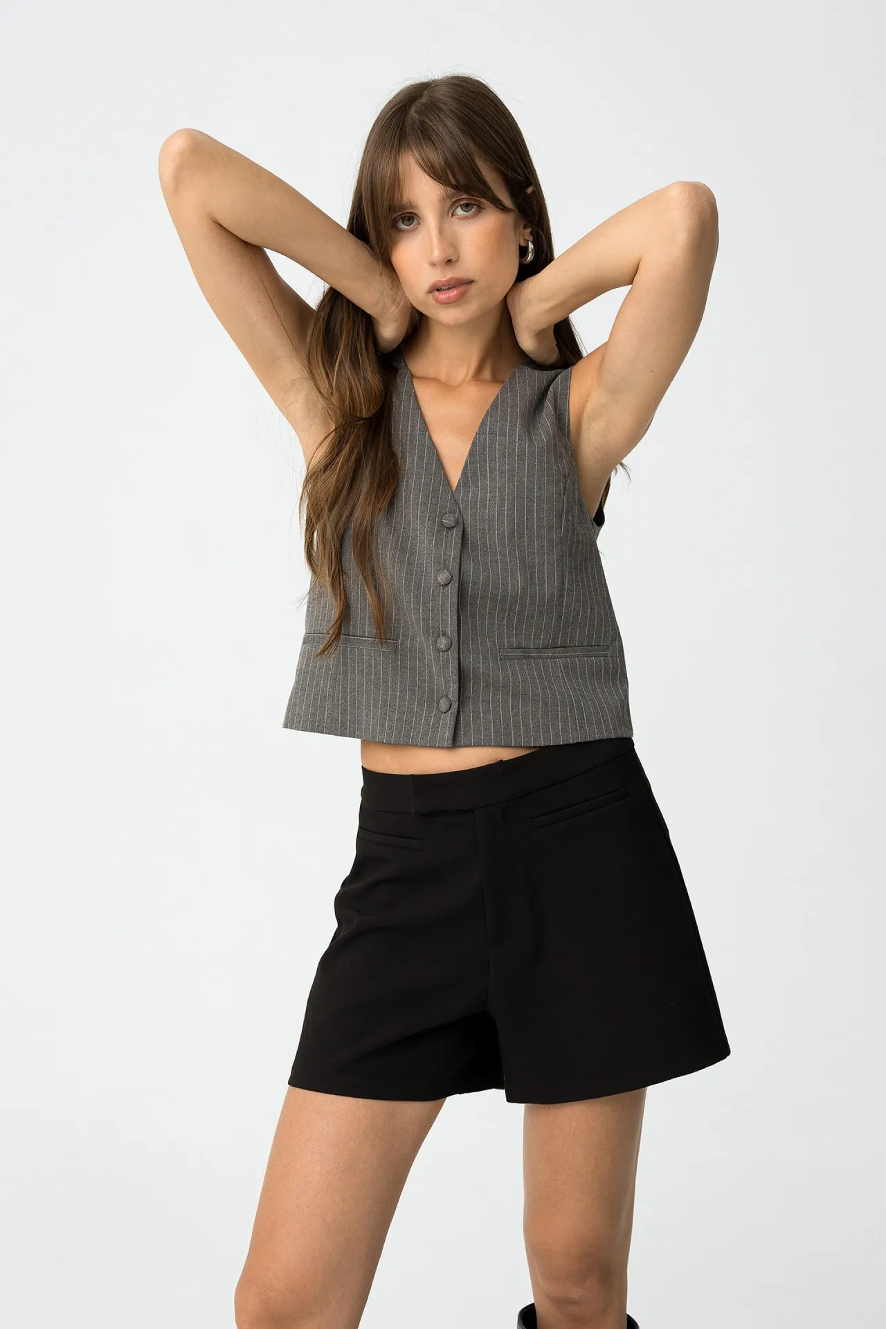 Chaleco slim fit de mujer en gris con raya diplomática. Elegancia moderna con escote en V y cierre de botones, ideal para looks sofisticados y urbanos.