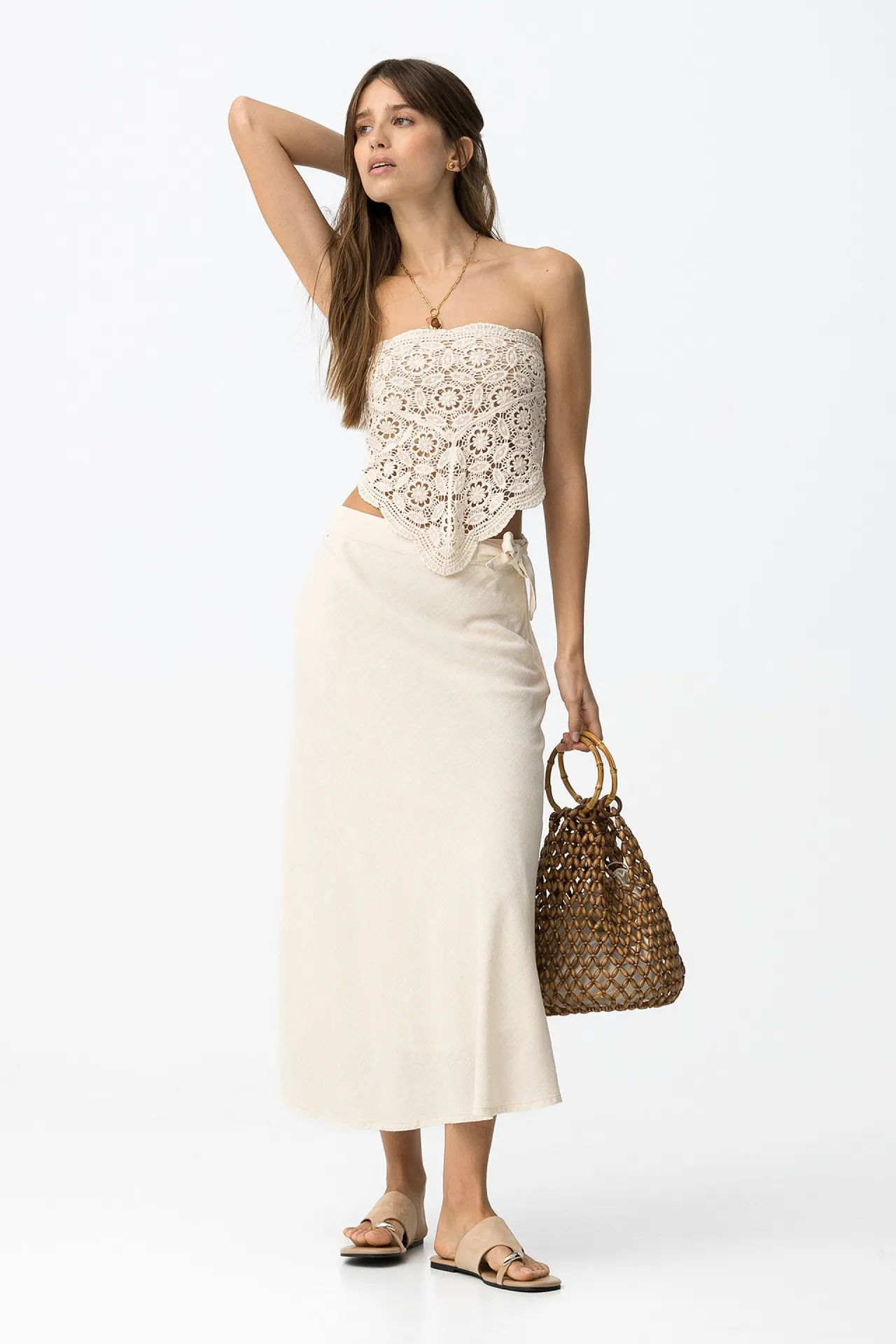Falda midi para mujer con tejido ligero y caída fluida. Una prenda versátil y fácil de llevar, disponible en versión beige lisa o estampada, perfecta para looks frescos, cómodos y con un punto cuidado.