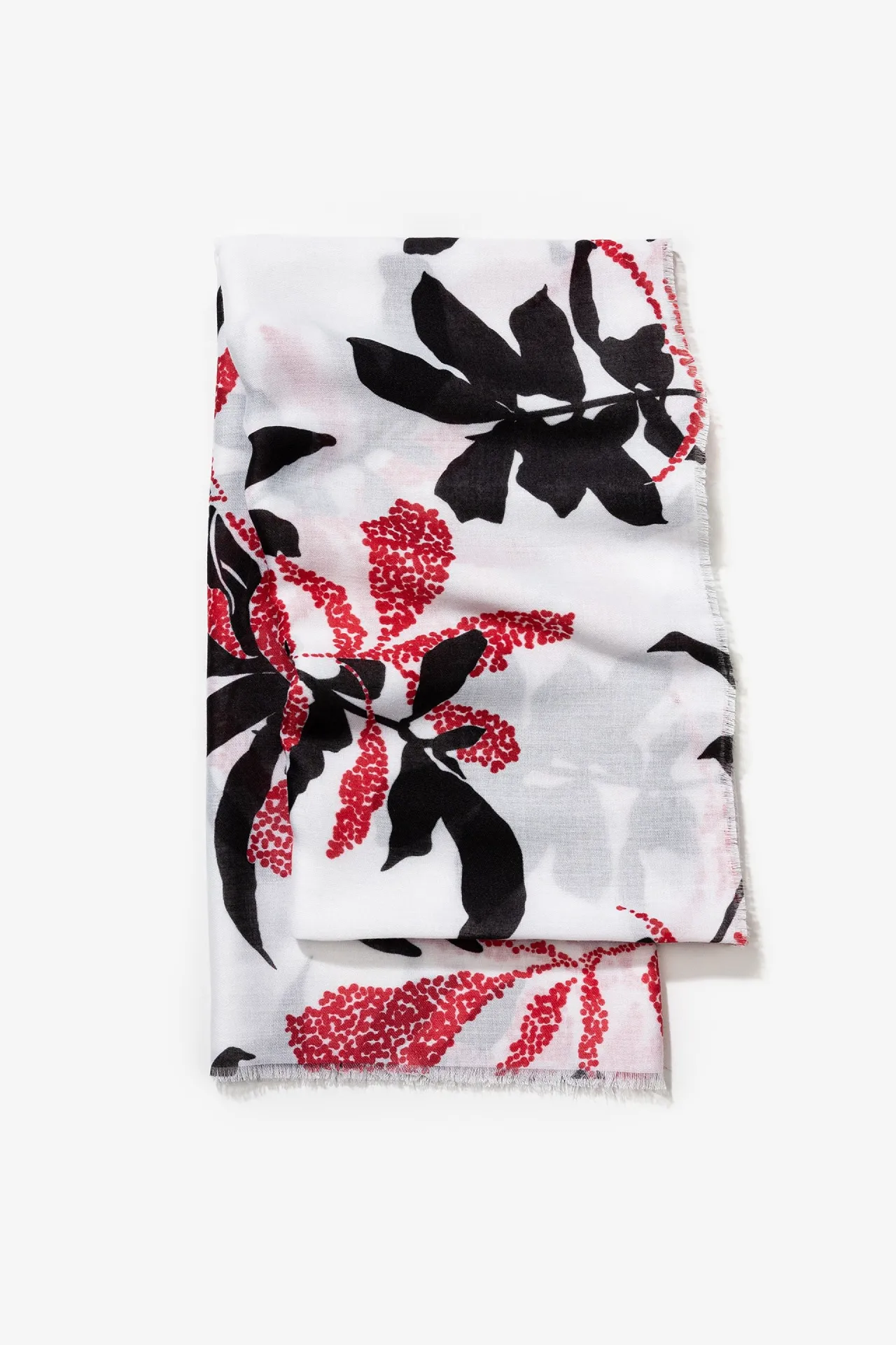 Este pañuelo rectangular combina elegancia y comodidad con un diseño floral en tonos rojo, negro y blanco que aporta frescura y estilo. Está confeccionado en tejido 100% poliéster, lo que garantiza una caída suave y ligera, perfecta para acompañar tanto looks de diario como conjuntos más formales. Su acabado deshilachado en los bordes añade un toque artesanal y moderno, aportando personalidad y movimiento al outfit. Es un accesorio versátil que realza desde un abrigo clásico hasta una camiseta básica.