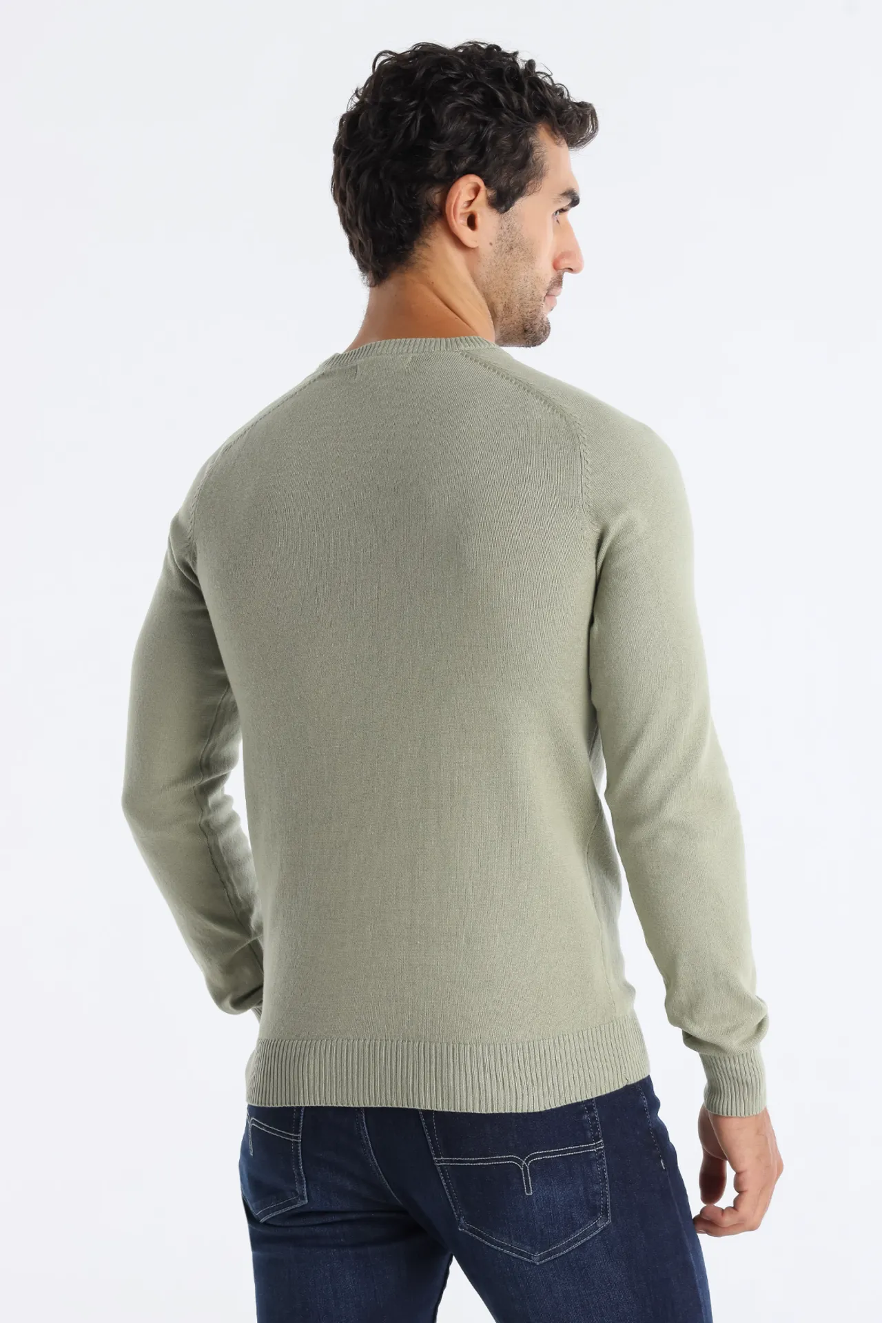 Su tono verde suave combina fácilmente con vaqueros o pantalones chinos, aportando un aire natural y sofisticado. El tejido en punto fino lo hace perfecto para entretiempo o para usar bajo chaquetas y abrigos.