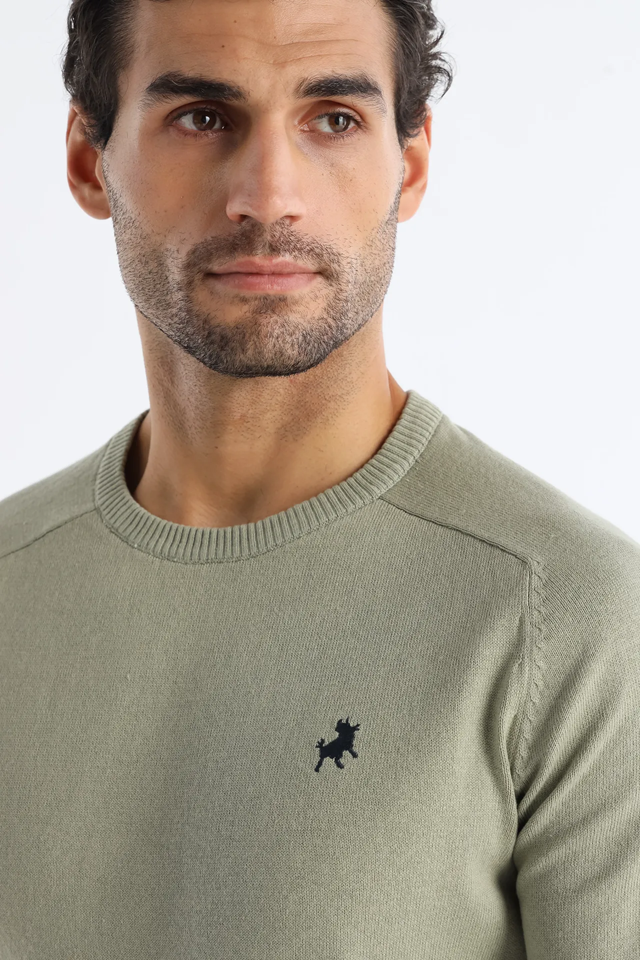 Jersey Lois Jeans verde con cuello redondo y logo bordado del toro. Confeccionado en punto suave de algodón y nylon. Corte regular fit, ideal para un look casual y elegante.