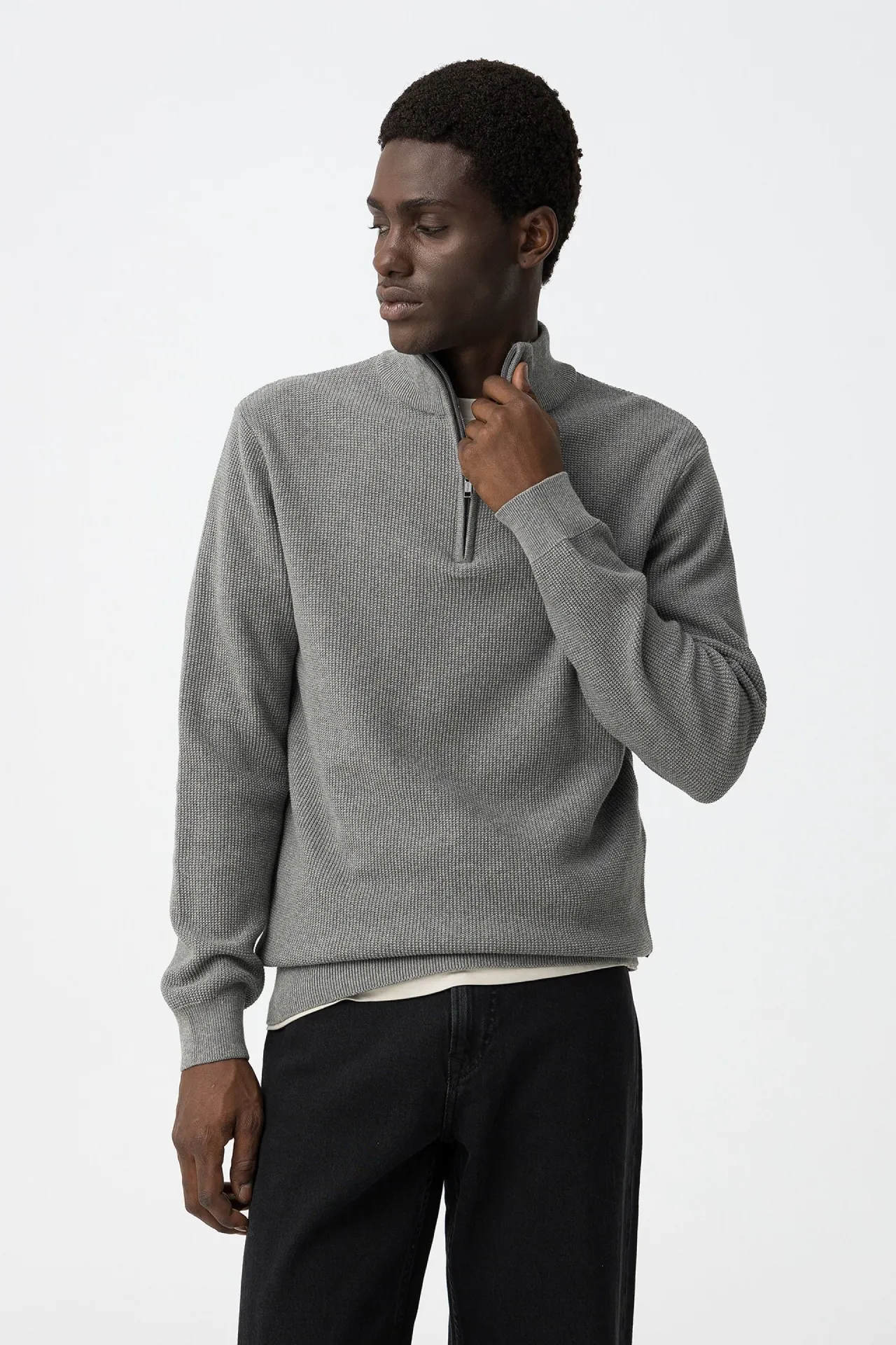 Jersey de algodón con cuello alto y media cremallera, cómodo, versátil y disponible en gris y beige.