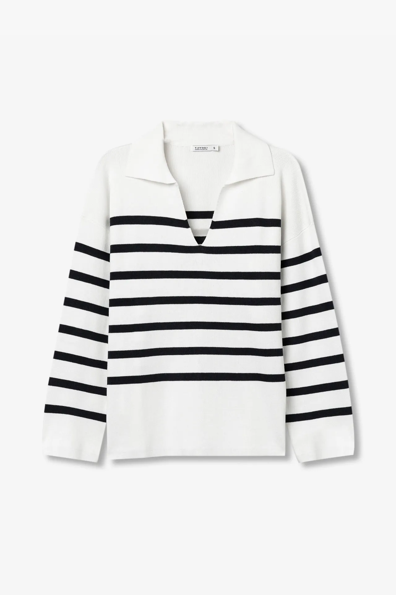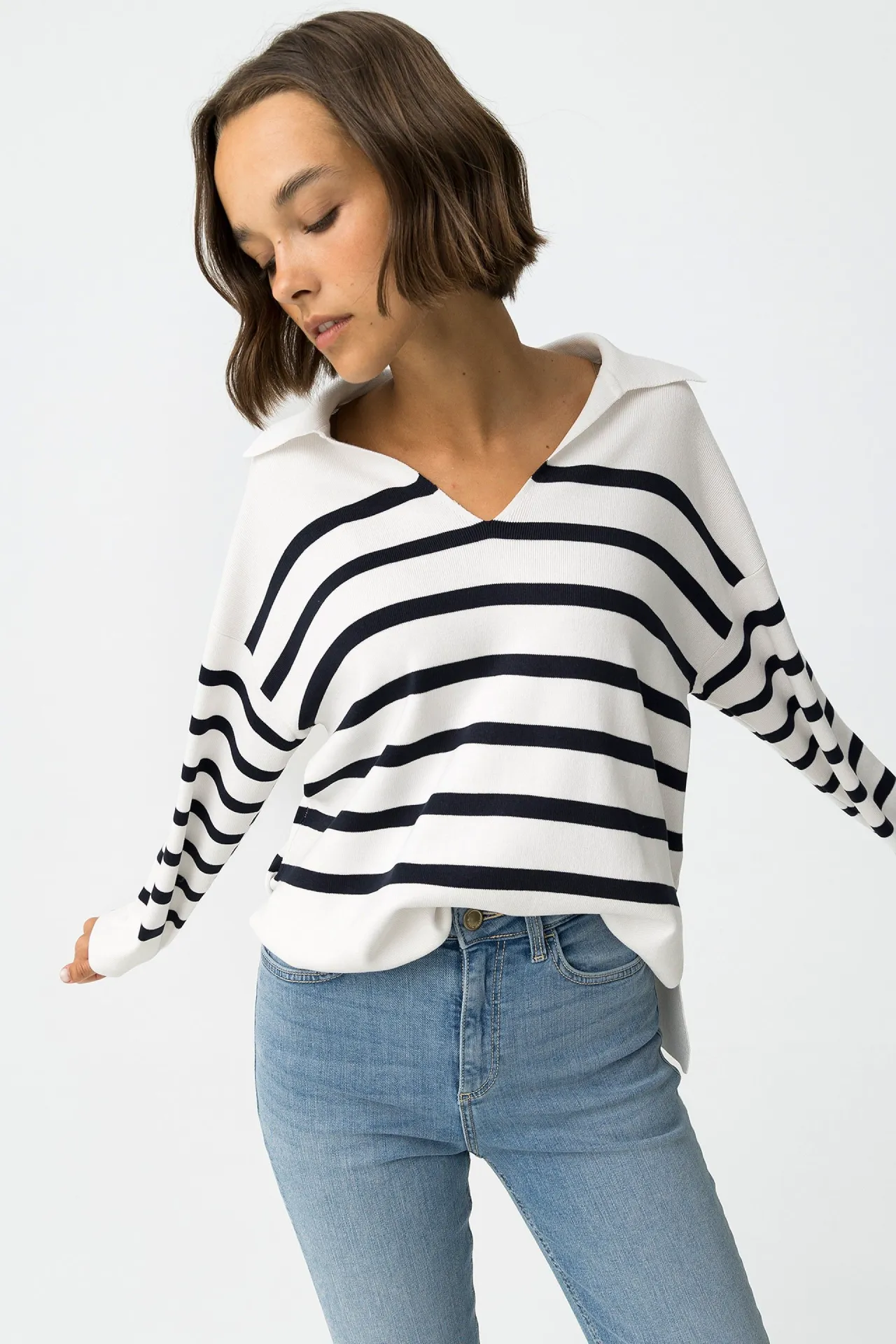 Jersey punto rayas en azul marino y blanco, con corte relajado y cuello en pico. Suave, cómodo y con estilo marinero.