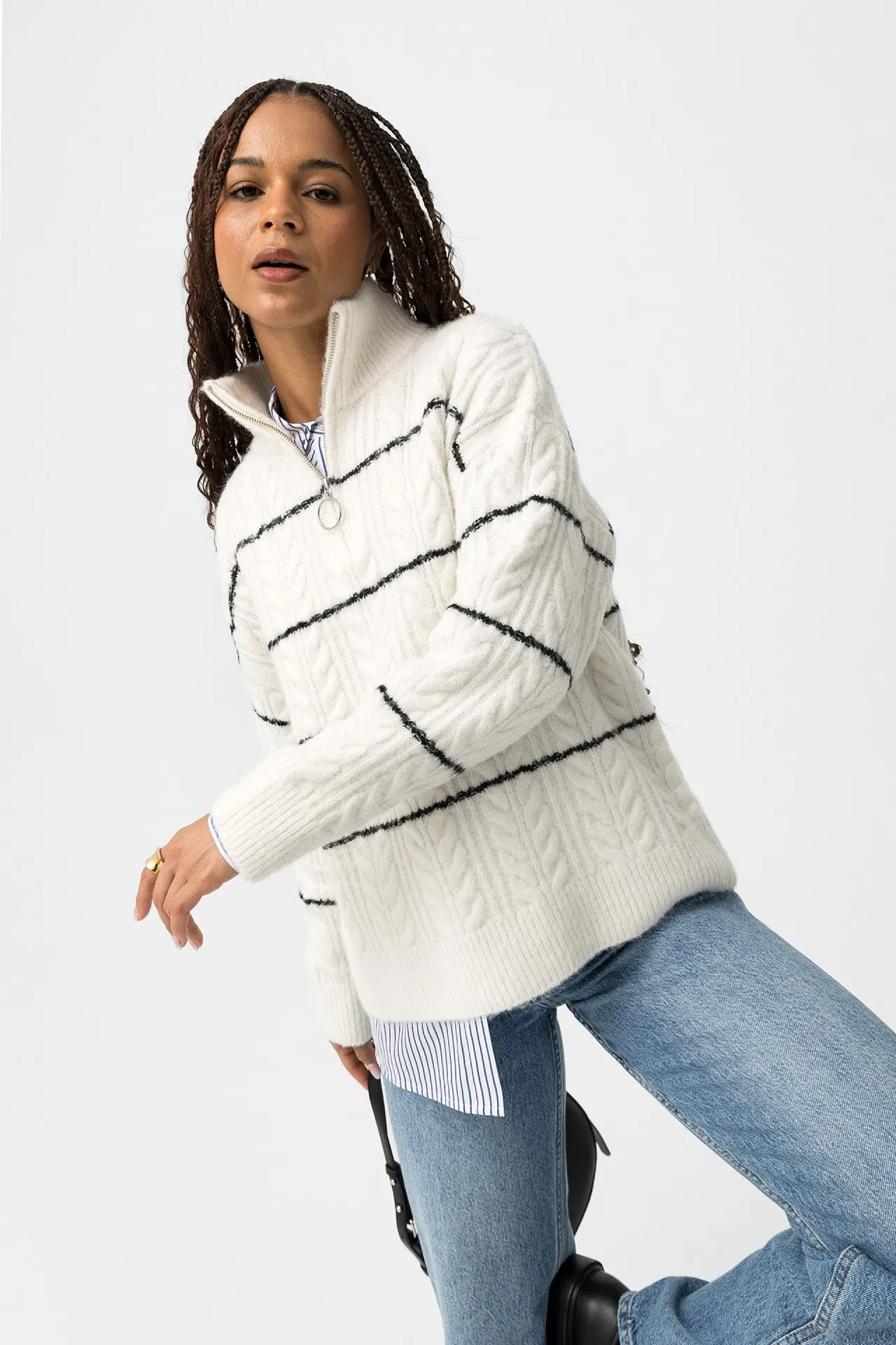 Jersey Punto Rayas – Jersey trenzado blanco con rayas negras y cremallera