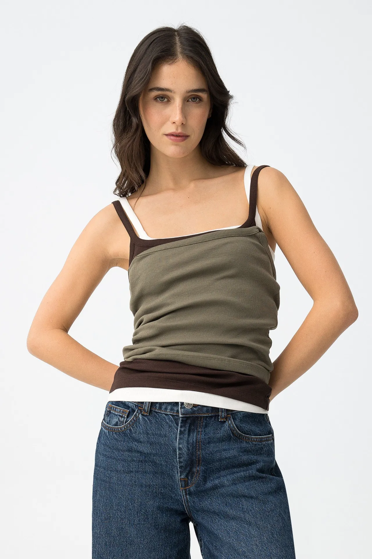 Pack de tops canalé para mujer con tirantes finos y corte super slim. Incluye tres colores versátiles: chocolate, verde y blanco. Su tejido elástico de algodón con textura acanalada se adapta al cuerpo y aporta comodidad para el uso diario.