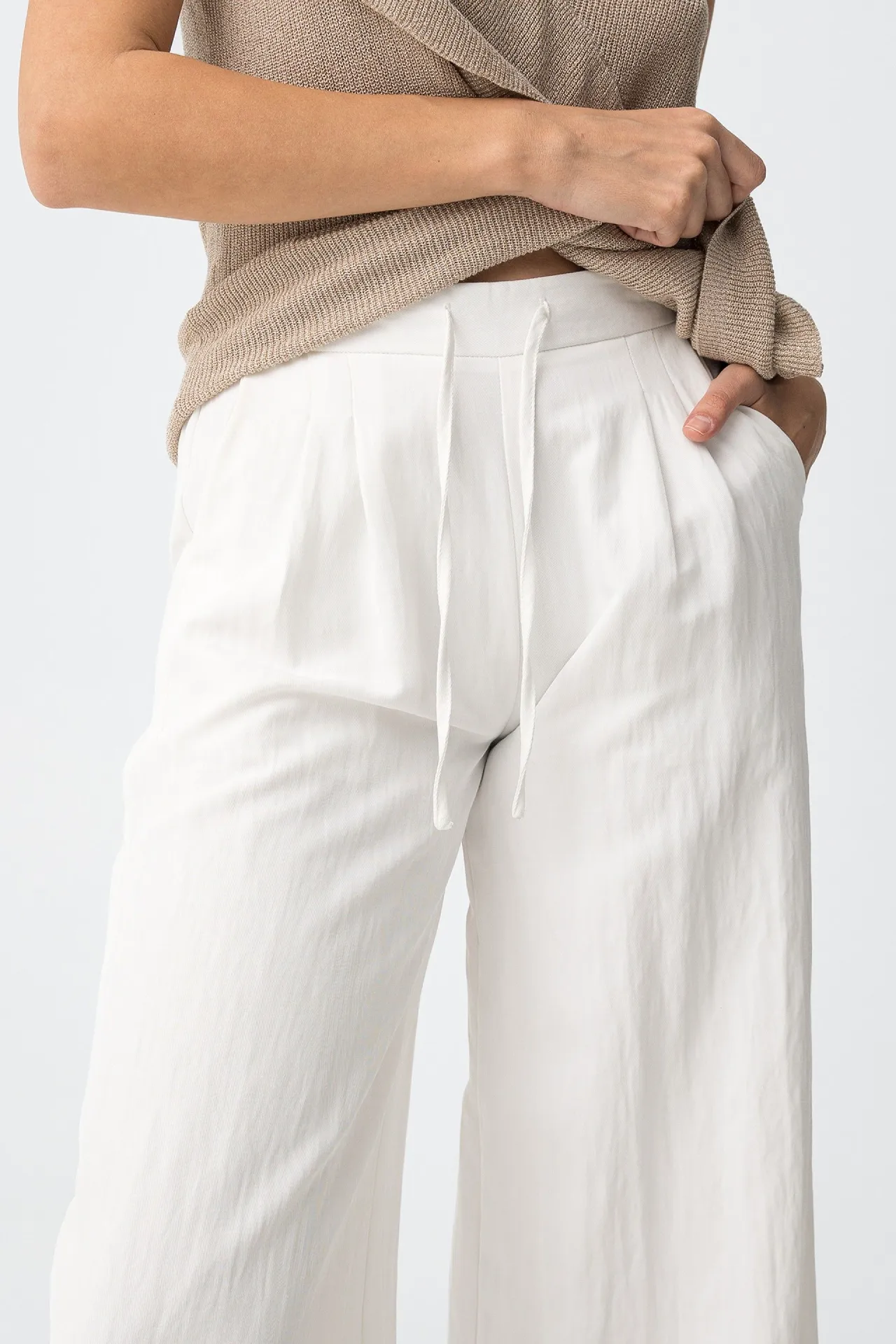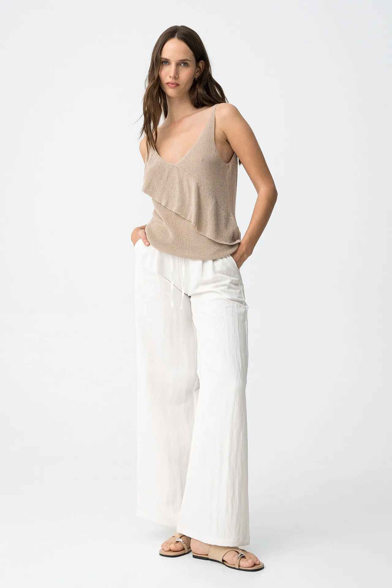 Pantalón ancho crudo para mujer, ligero, cómodo y muy fácil de combinar. Su corte palazzo y la cintura elástica con cordón lo convierten en una opción fresca y práctica para looks relajados con un estilo limpio y actual.