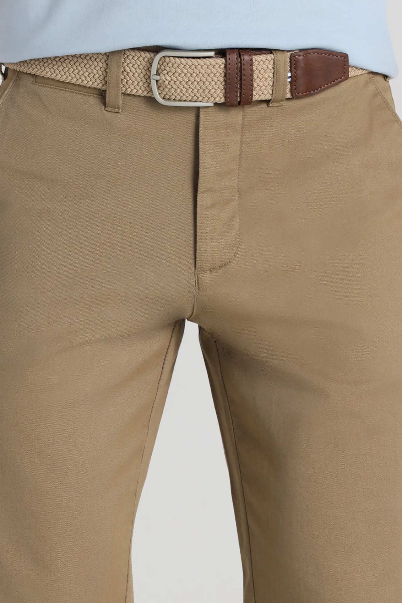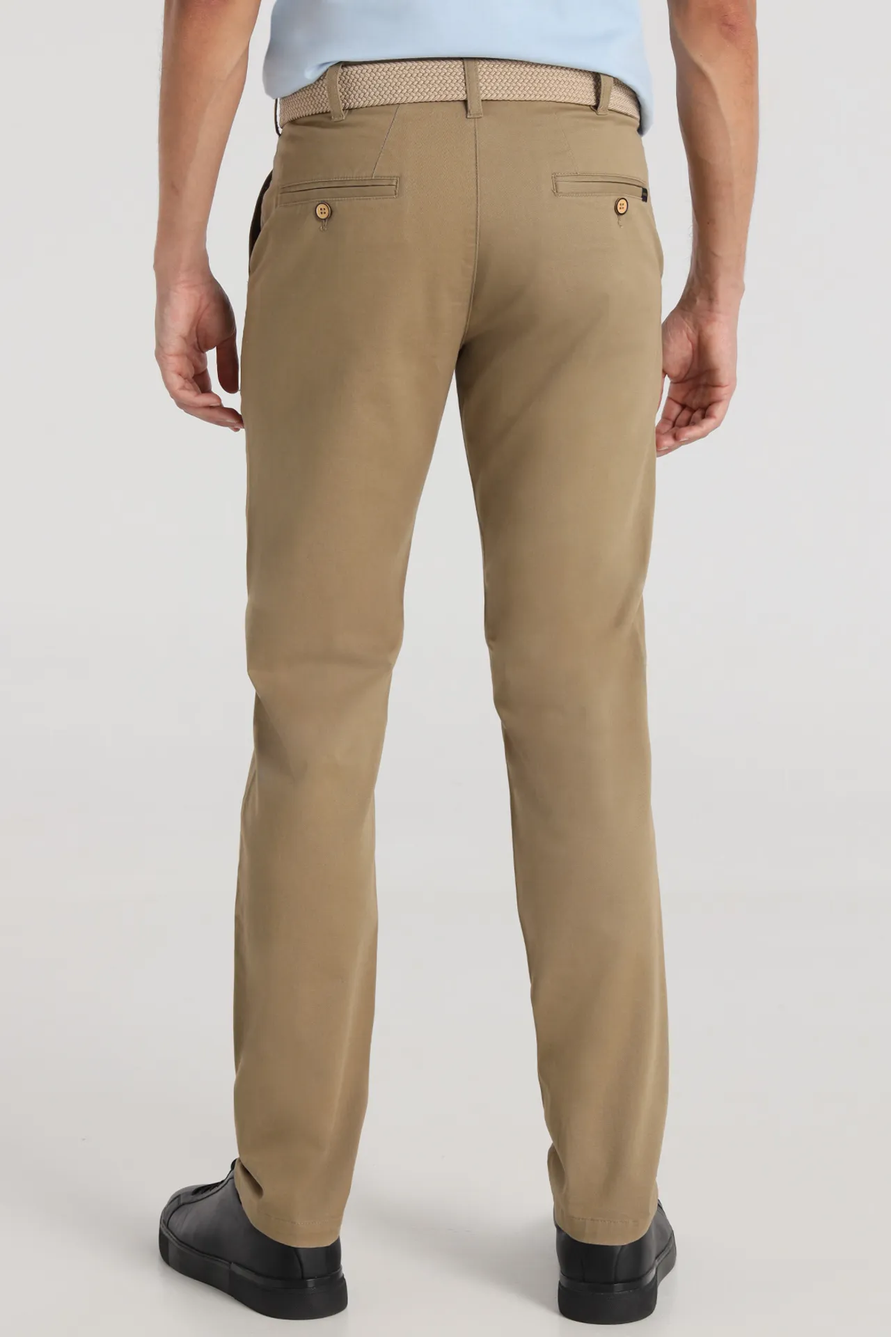 Pantalón chino regular fit para hombre en algodón elástico. Cómodo, versátil y con cinturón trenzado incluido. Disponible en azul marino, beige y verde.