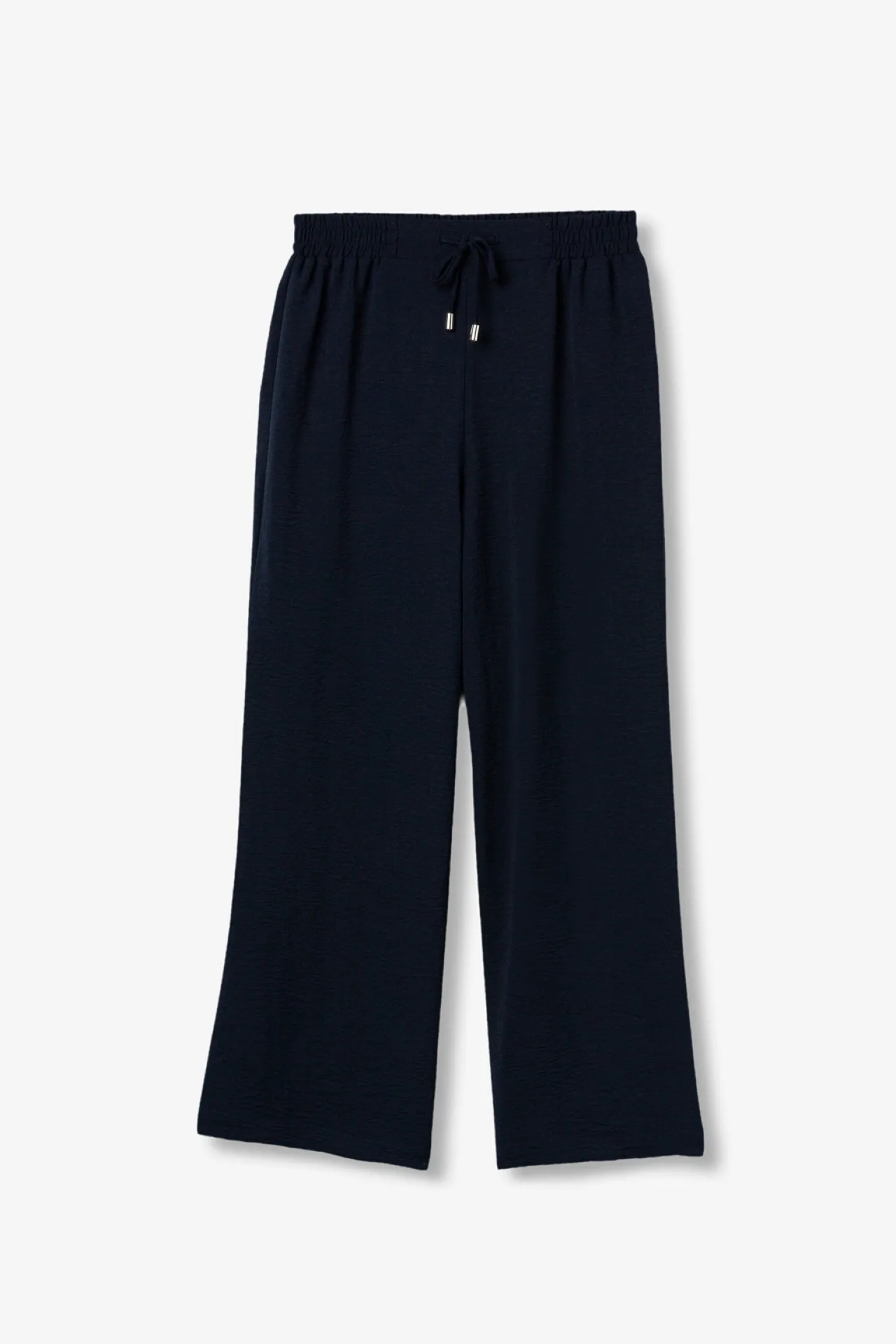 Pantalón fluido wide leg para mujer con tejido ligero y cintura elástica con cordón ajustable. Una prenda fresca y cómoda perfecta para los días de verano y para crear looks relajados con estilo.