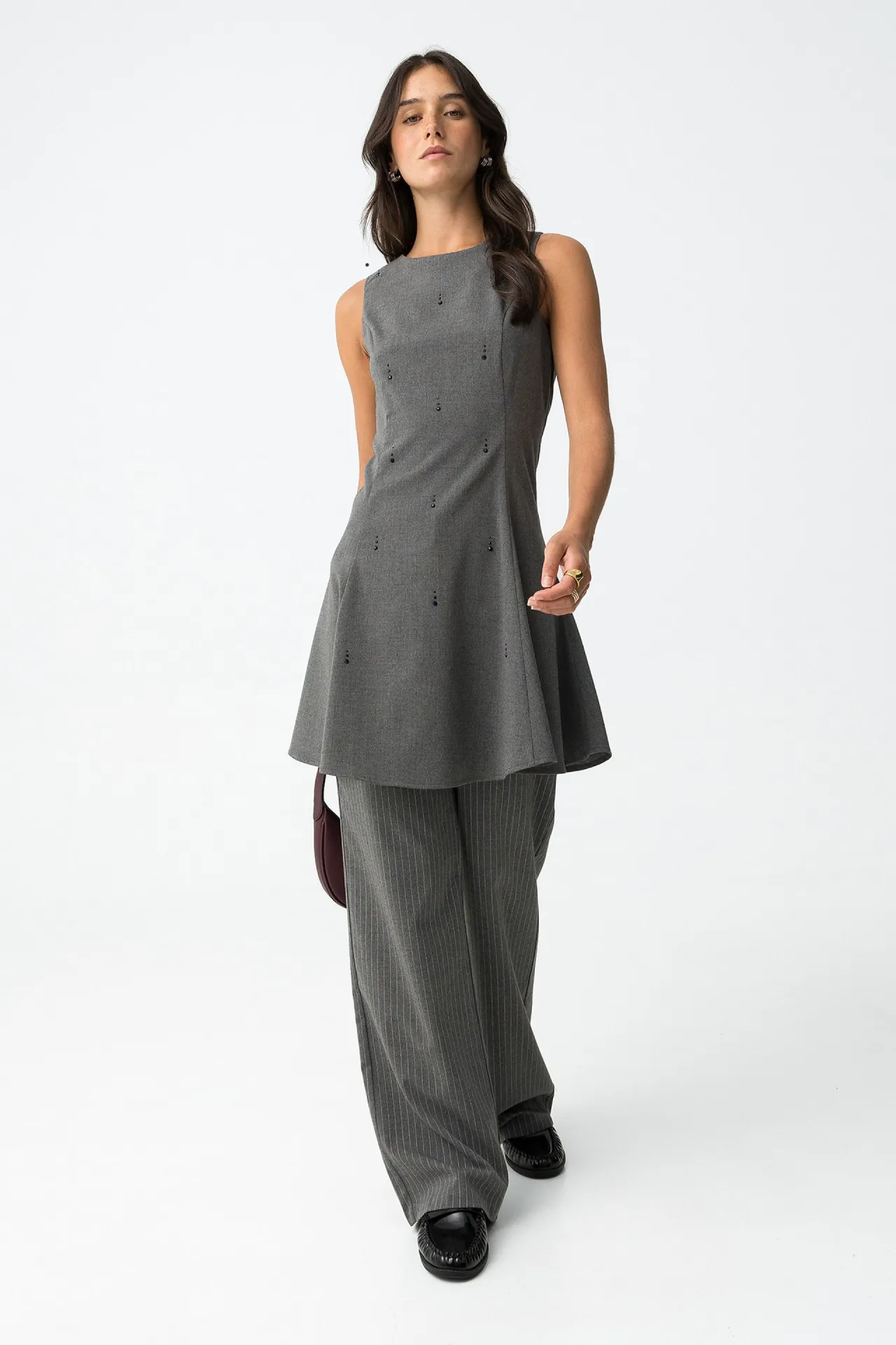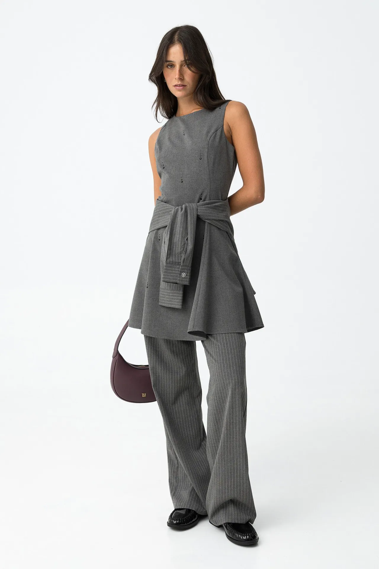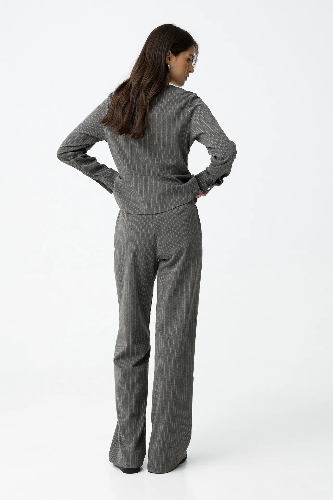 El tono gris con rayas finas blancas aporta sobriedad y elegancia, combinando fácilmente con chaquetas o camisas para un look de oficina impecable.