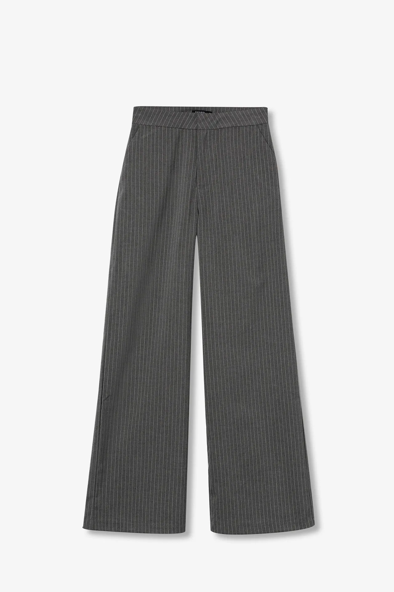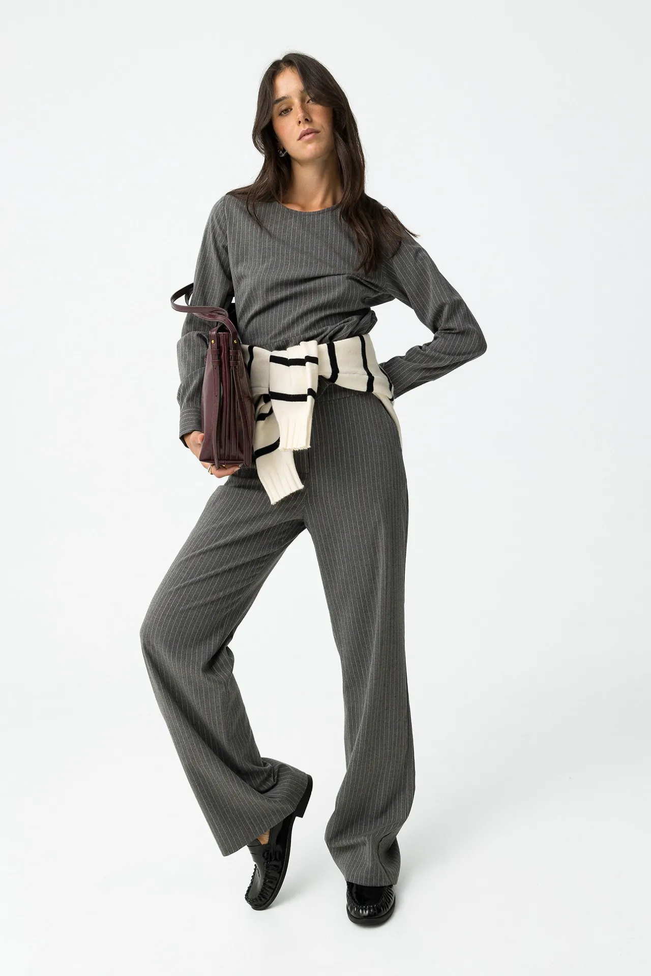 Pantalón vestir a rayas finas, cintura alta y diseño elegante. Ideal para looks formales o casual chic.
