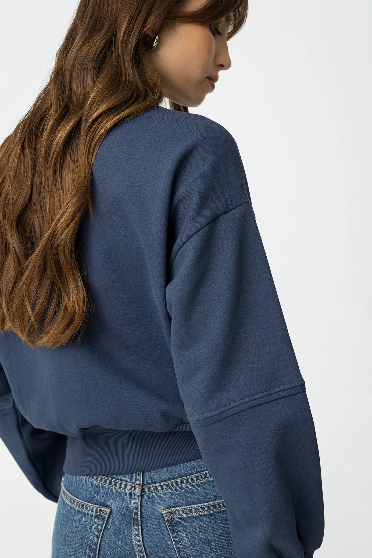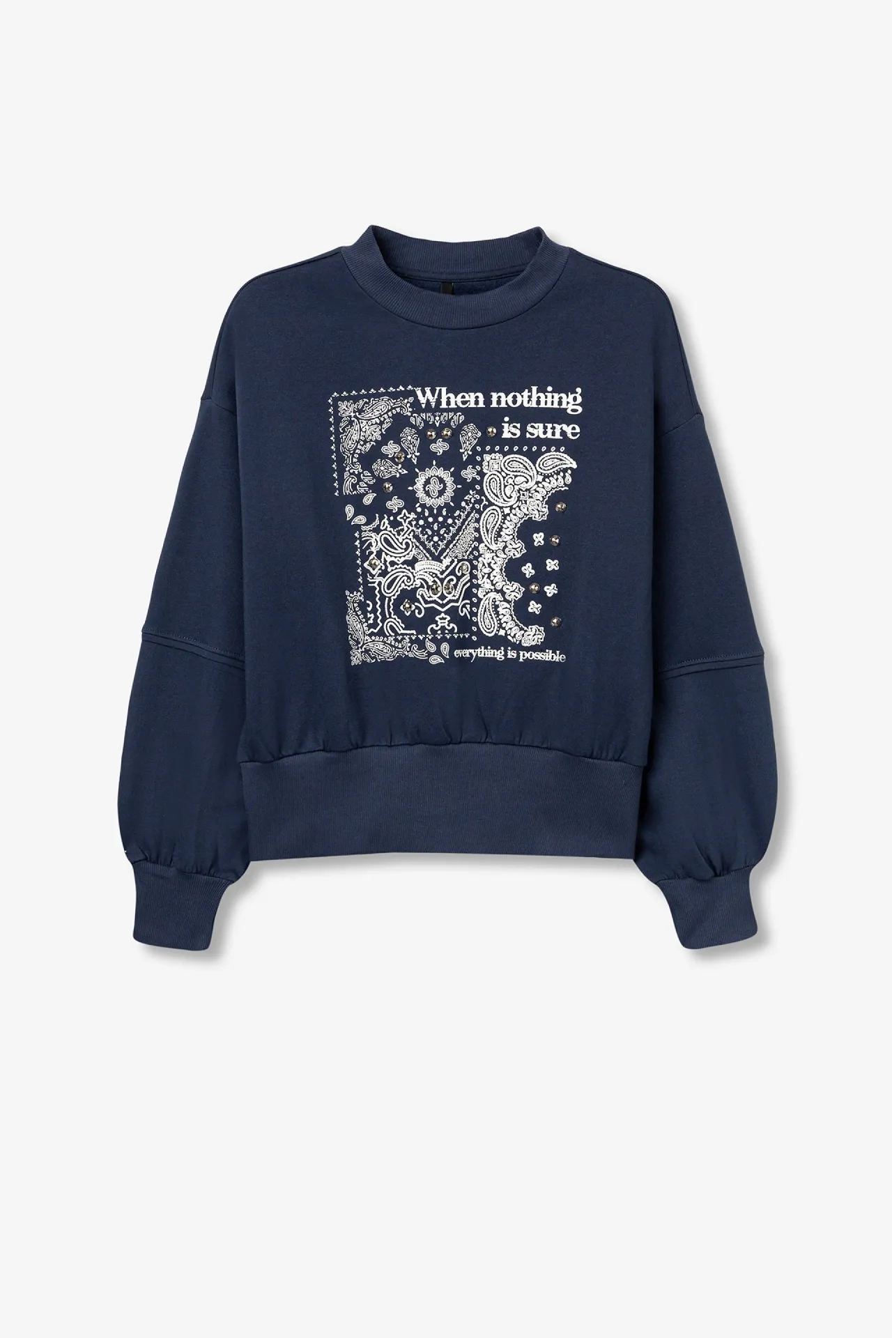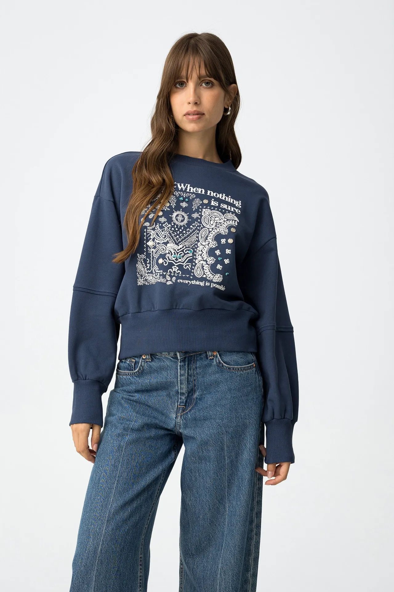 Sudadera azul de mujer regular fit con estampado paisley en relieve y cuentas bordadas. Confeccionada en 100% algodón, cómoda y con interior afelpado para mayor suavidad.