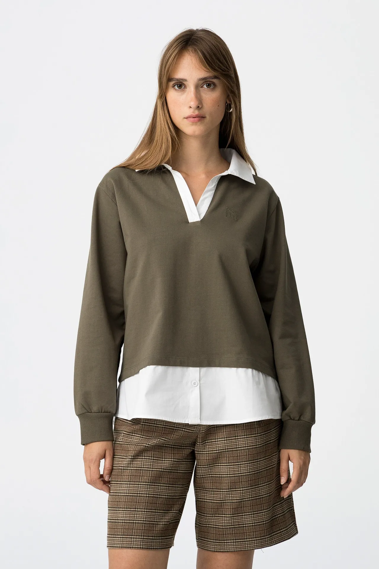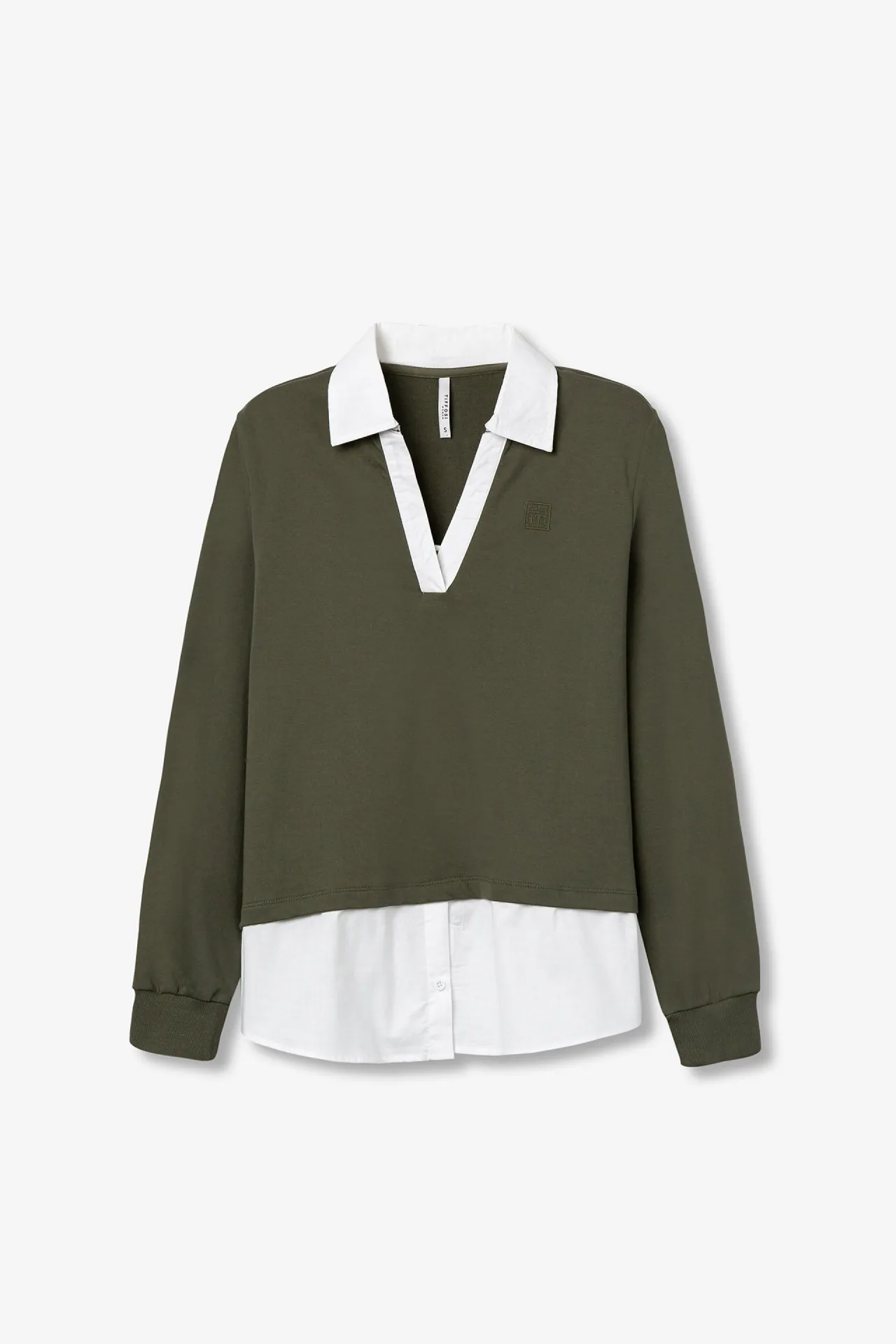Sudadera regular fit en 100% algodón, con cuello tipo camisa y escote en V. Incorpora recortes de camisa en bajo y cuello para un efecto de capas elegante. Manga larga con puños acanalados, perfecta para un look casual con un toque sofisticado.