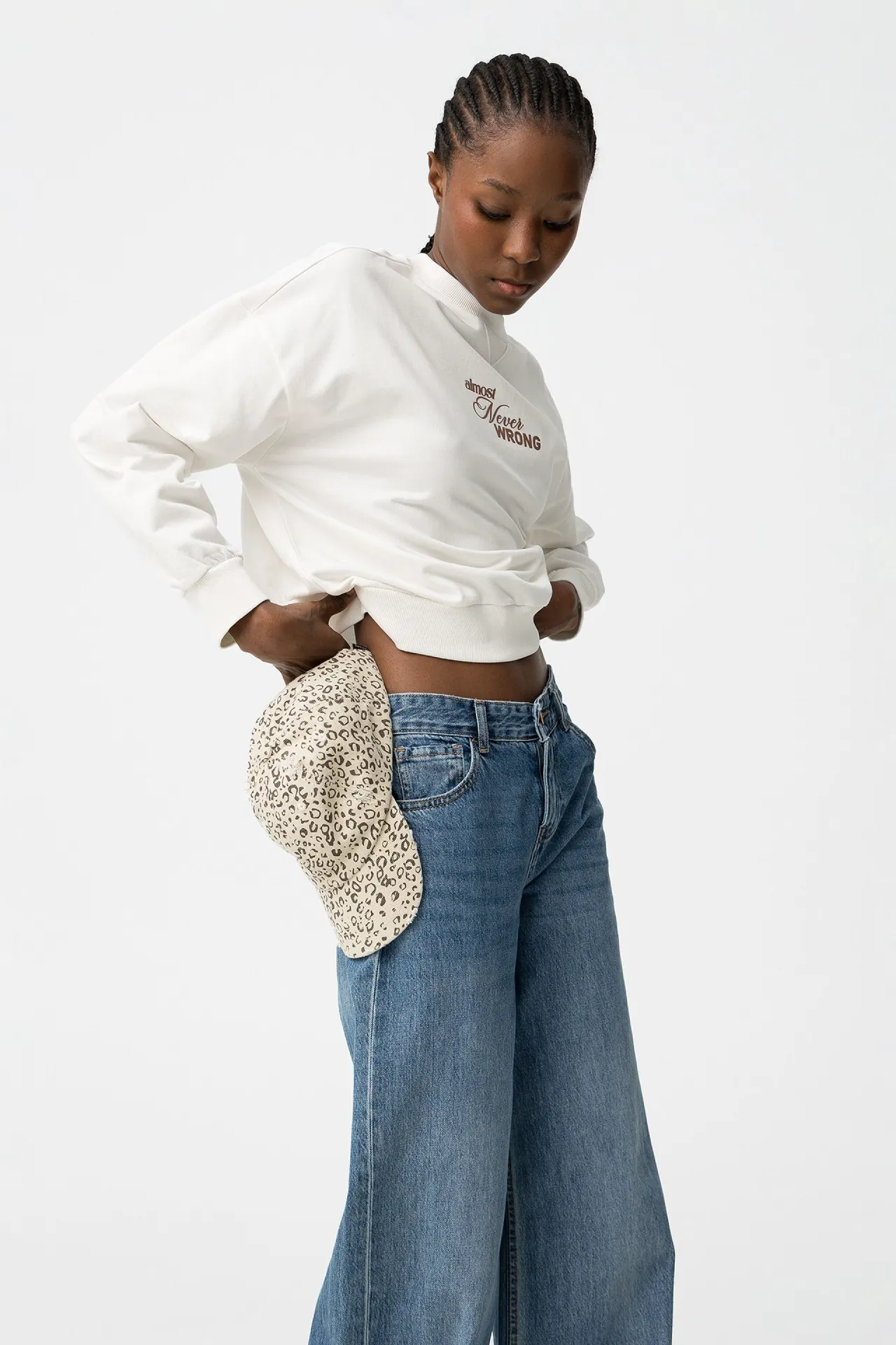 Sudadera sin capucha oversize de chica con mensaje en relieve, cuello redondo y acabado en canalé. Su interior afelpado aporta calidez y comodidad en cualquier ocasión.