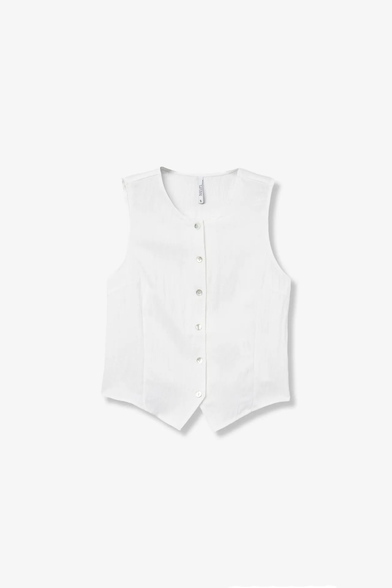 Top blanco para mujer sin mangas, con botones frontales y bajo acabado en pico. Una prenda fresca, ligera y muy fácil de combinar, perfecta para looks de verano con un estilo limpio, actual y femenino.