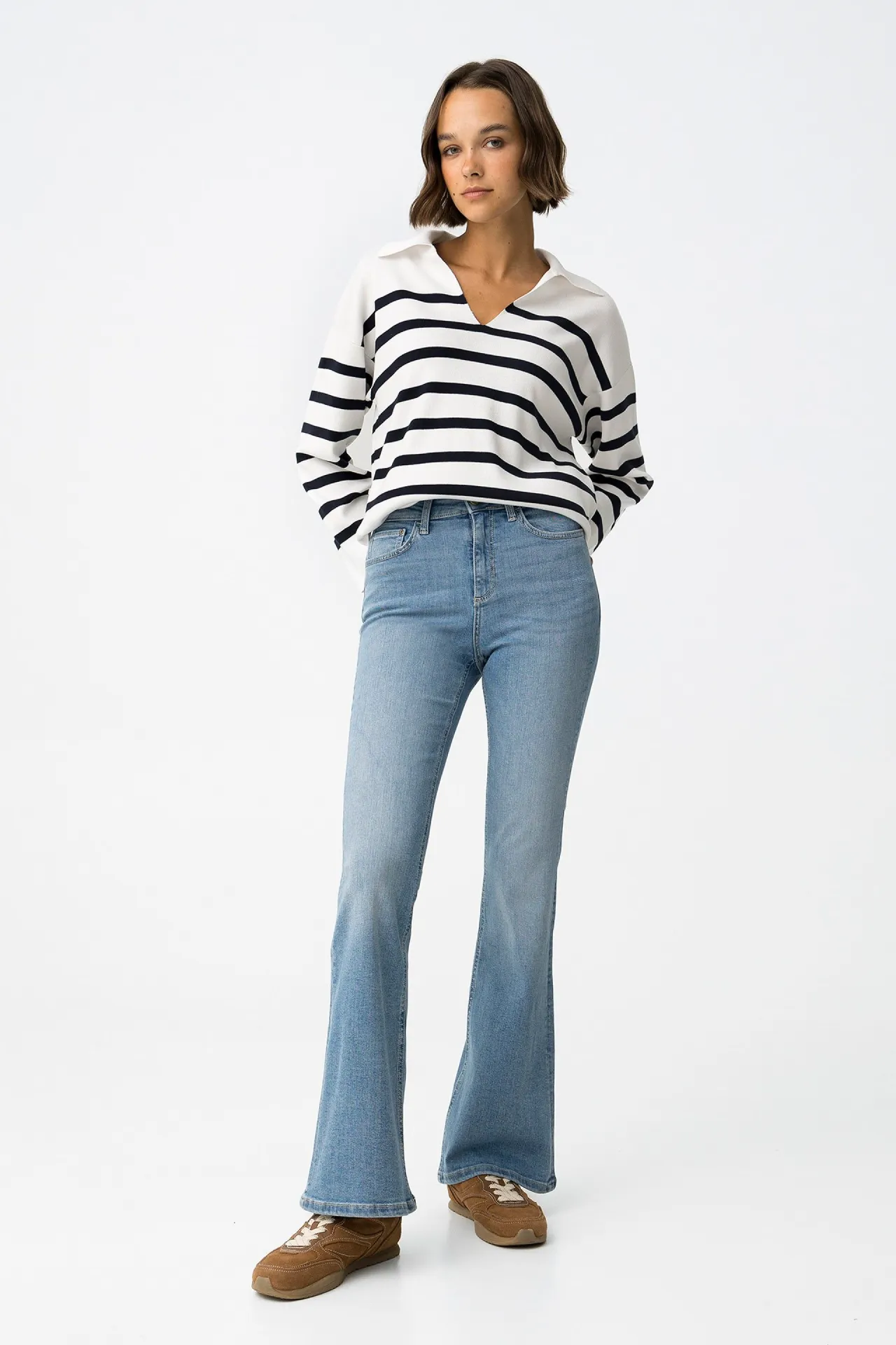 Vaquero campana de tiro alto para mujer confeccionado en denim elástico. Un pantalón con inspiración retro que estiliza la silueta y aporta un toque moderno y elegante a cualquier look.