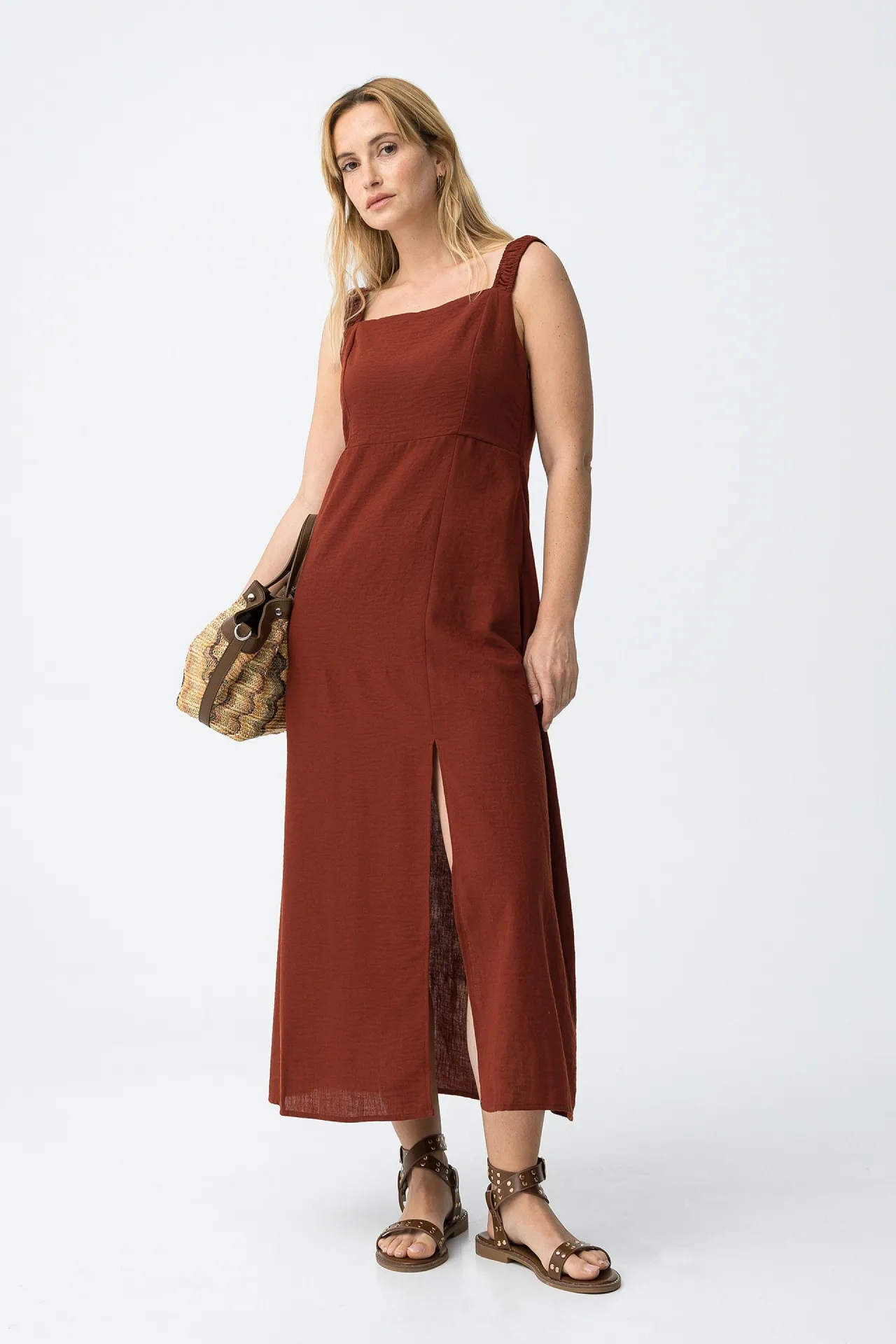Vestido midi para mujer con tirantes anchos fruncidos y abertura frontal. Un diseño fluido, cómodo y femenino que funciona perfecto para looks de verano o para estilismos relajados con un punto elegante.