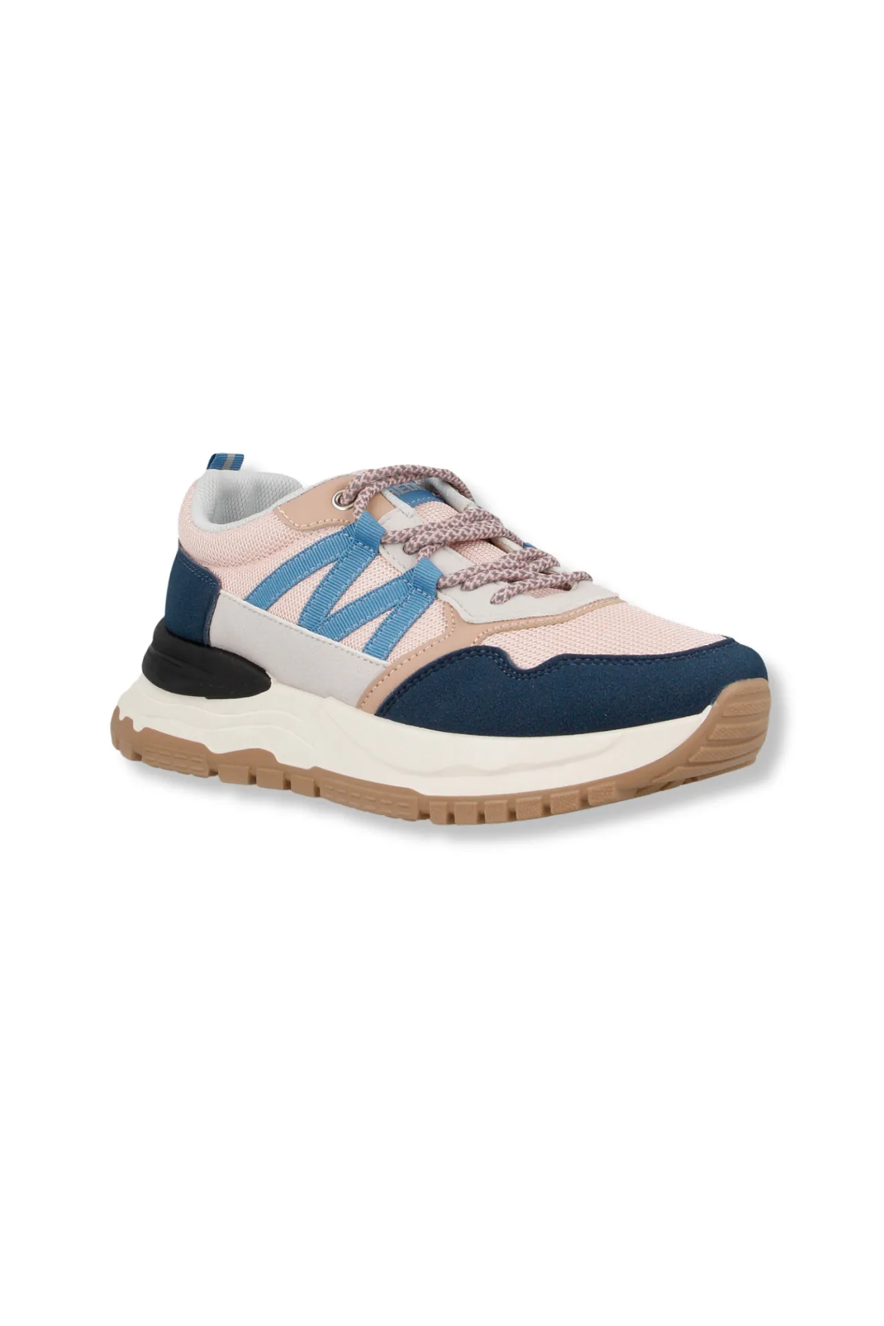 Su exterior combina textil y PU con refuerzos en contraste azul, logrando un diseño actual y versátil. El interior suave y transpirable se adapta al pie, mientras que los cordones de inspiración deportiva aportan un toque moderno. Perfectas tanto para looks casuales como para viajes y días activos.